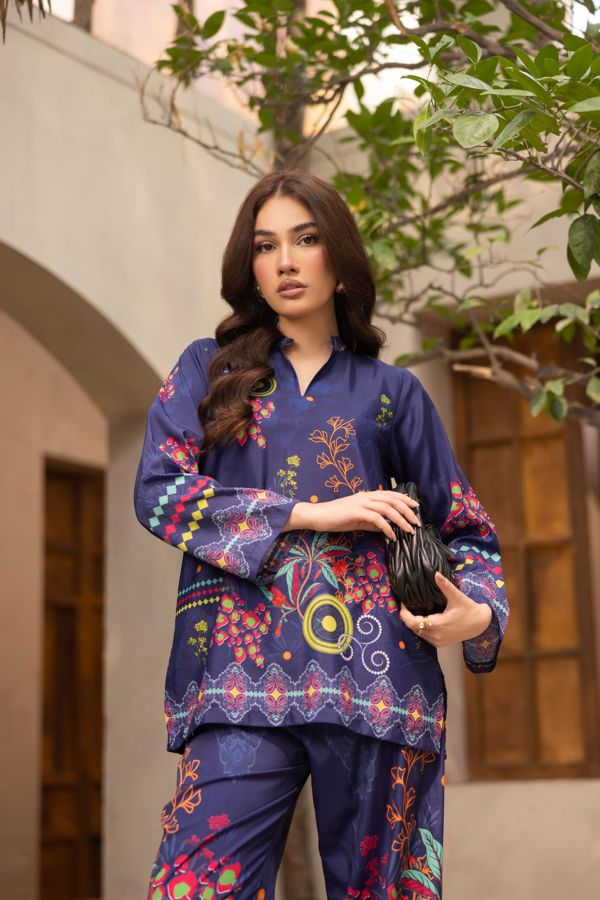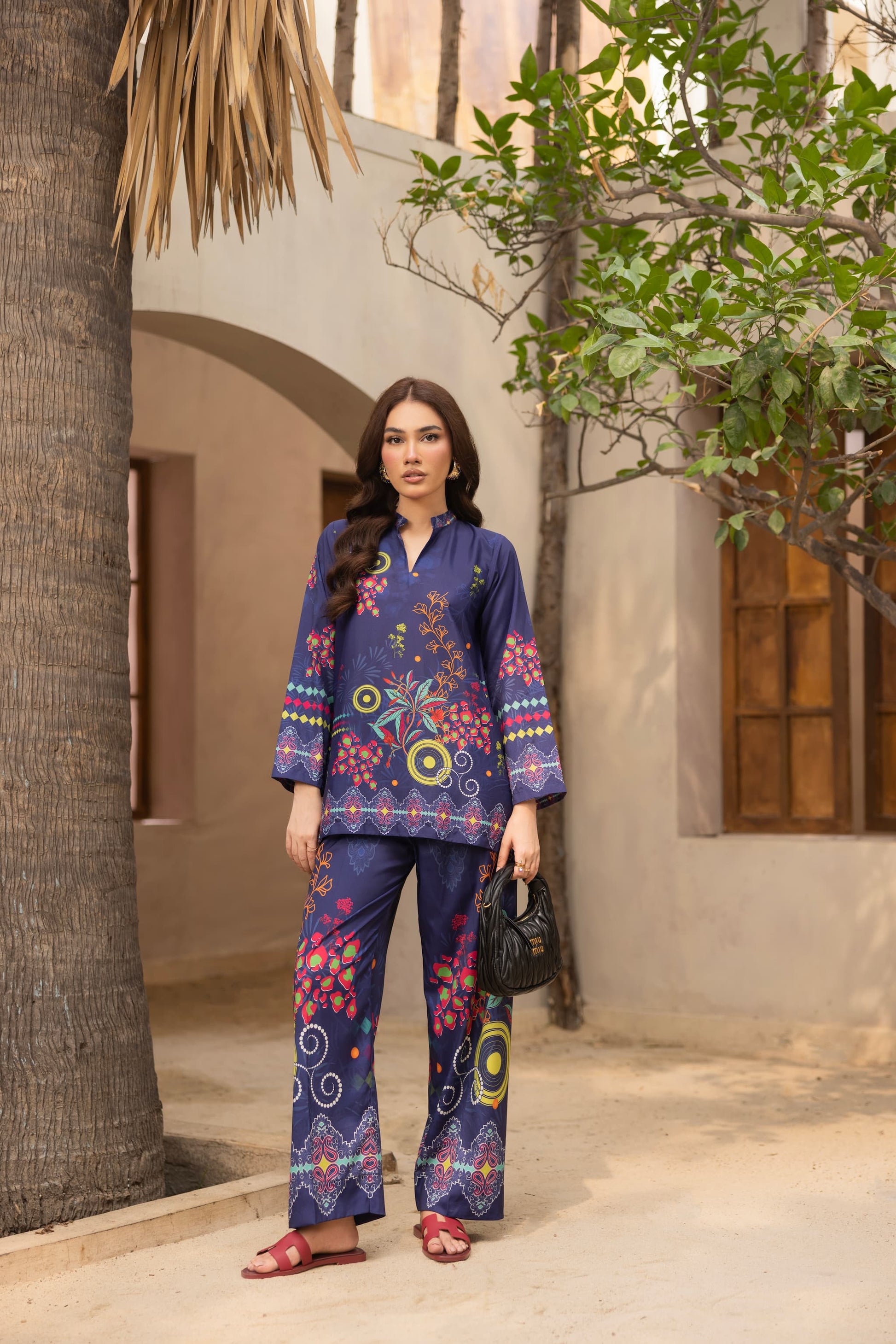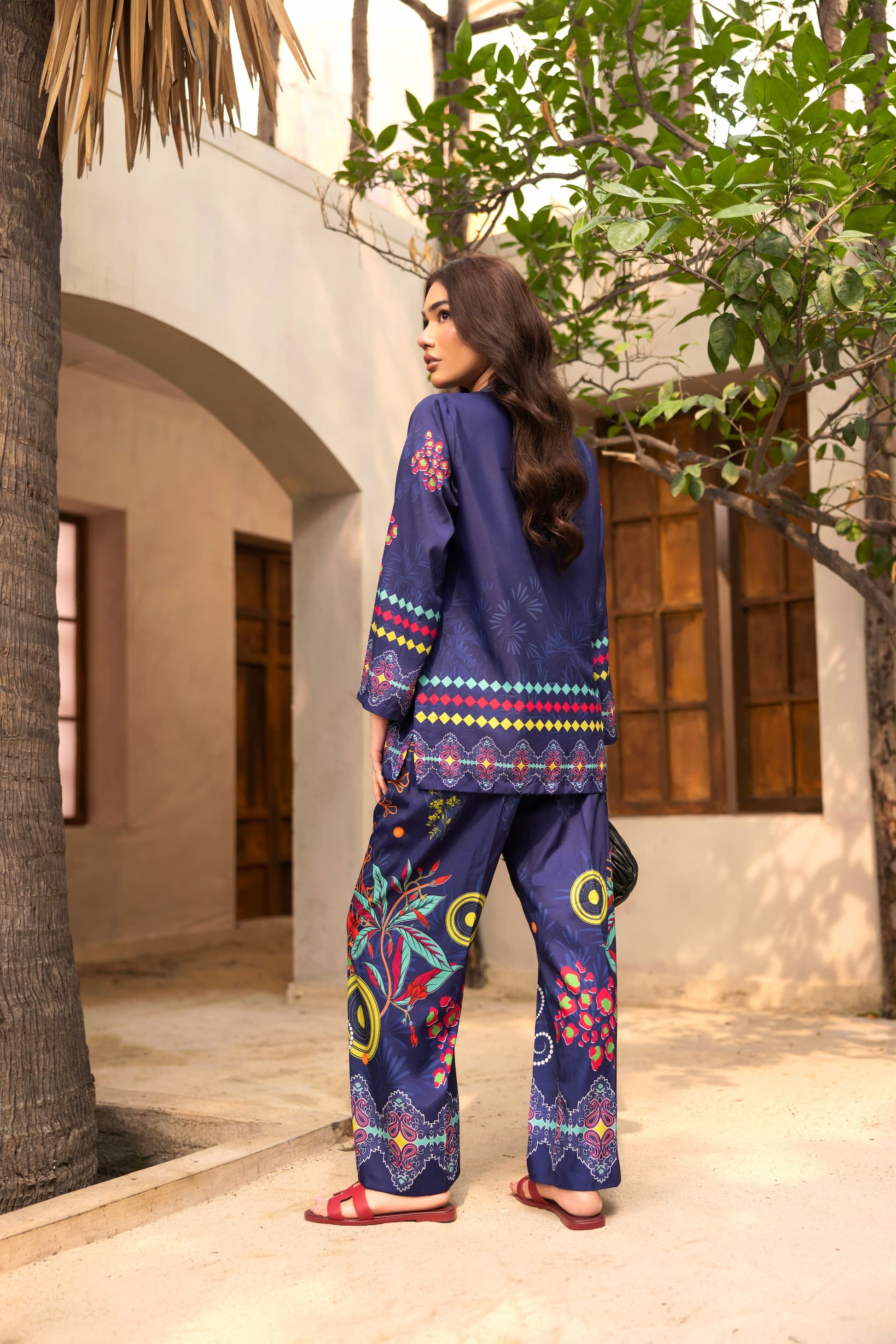Turn heads in Bluevela, a striking two –piece co-ord set made from soft crepe silk. Featuring a deep navy base with vibrant floral and geometric prints, this relaxed-fit set includes a straight-cut shirt and matching trousers: perfect for both daytime chic and evening flair.