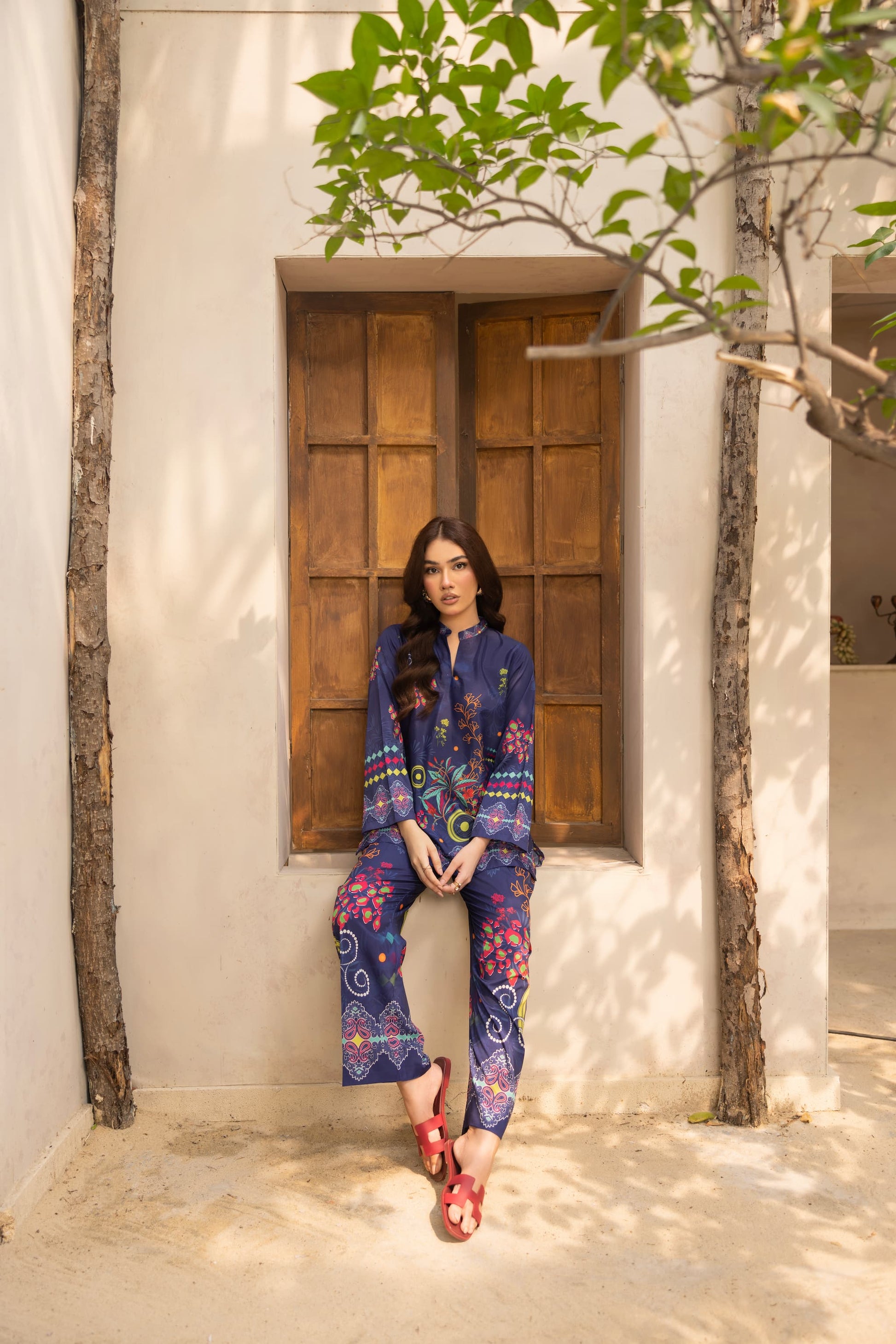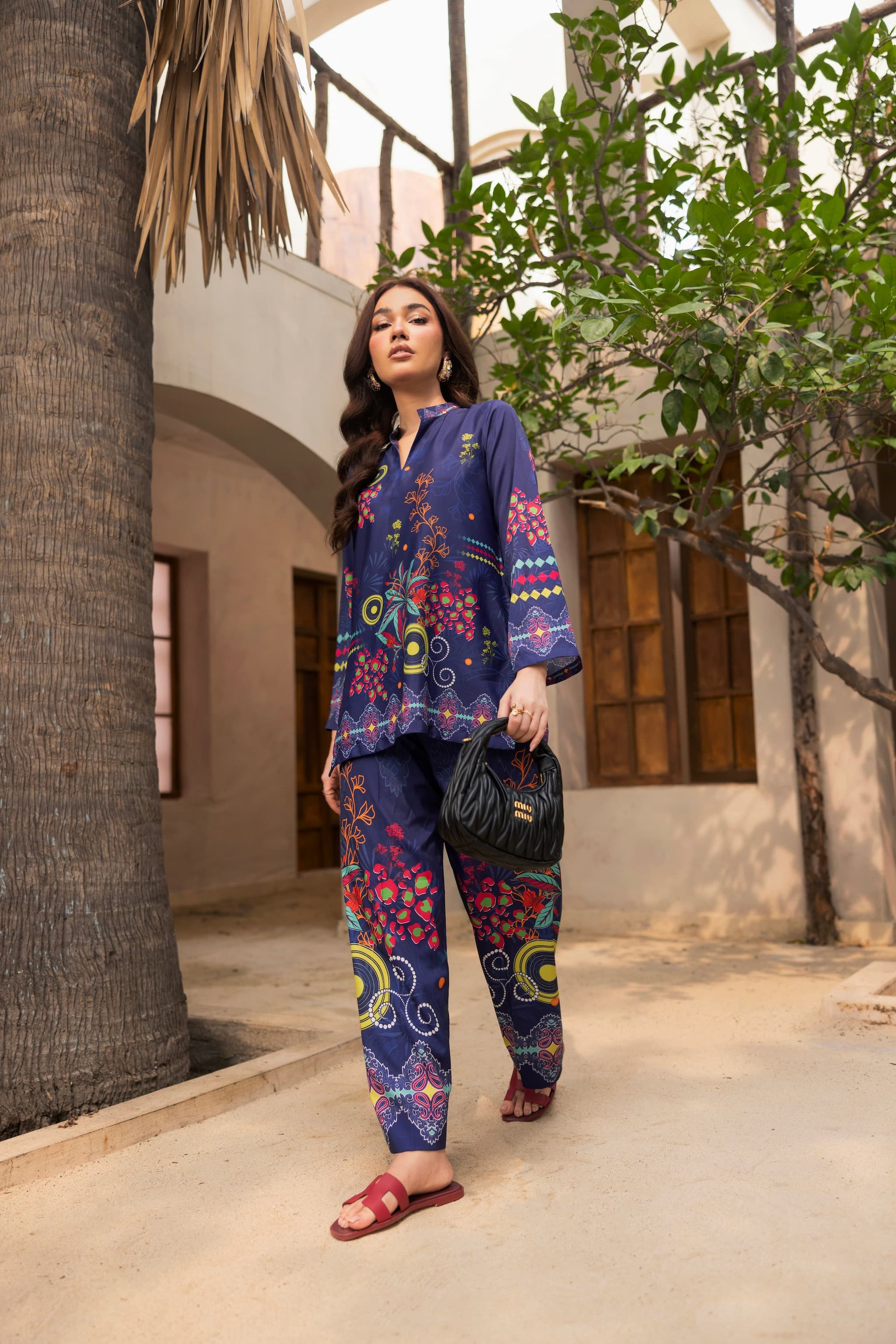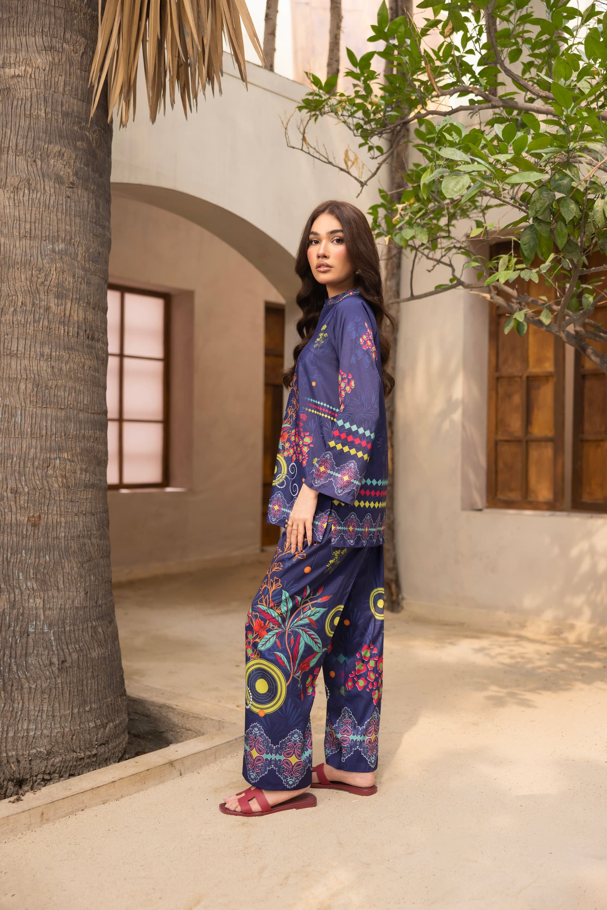 Turn heads in Bluevela, a striking two –piece co-ord set made from soft crepe silk. Featuring a deep navy base with vibrant floral and geometric prints, this relaxed-fit set includes a straight-cut shirt and matching trousers: perfect for both daytime chic and evening flair.