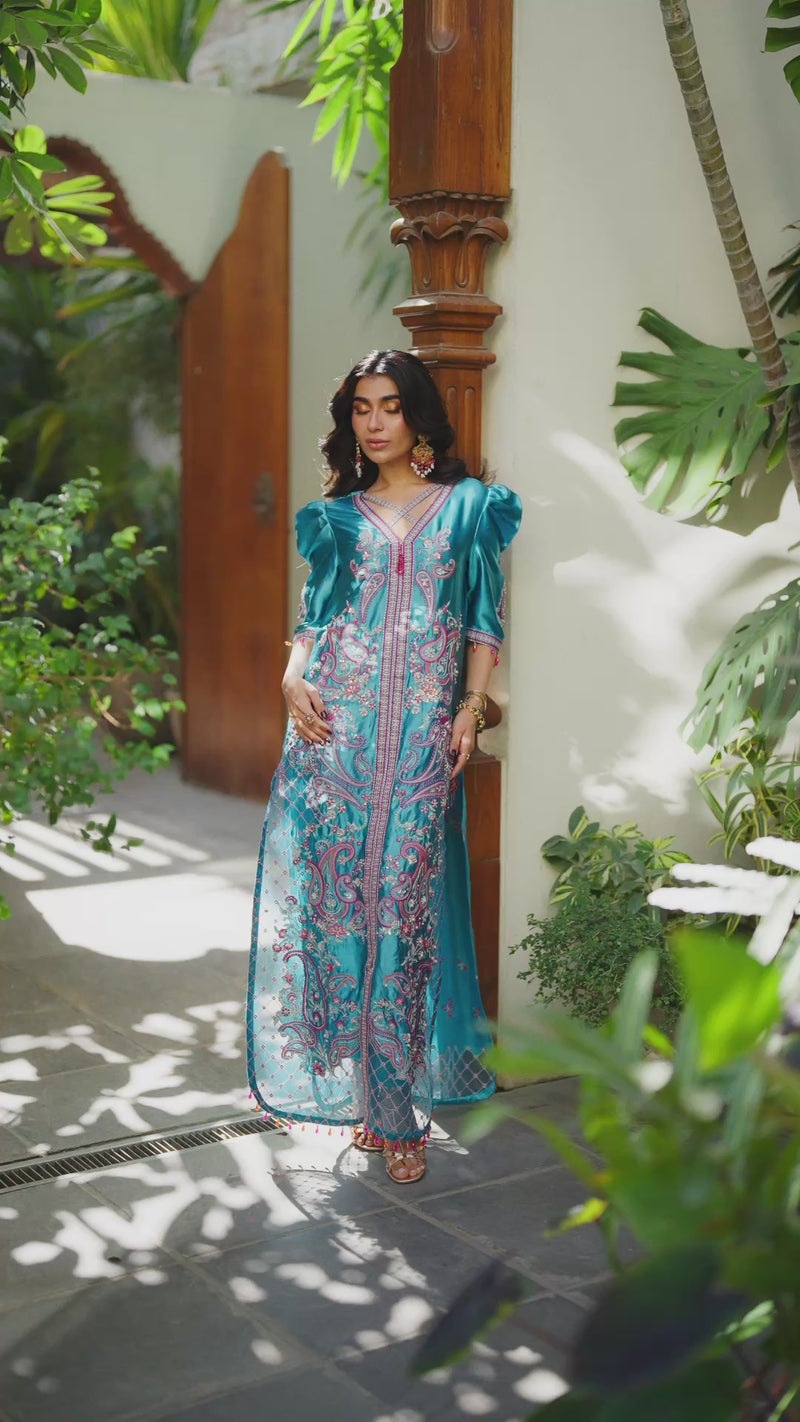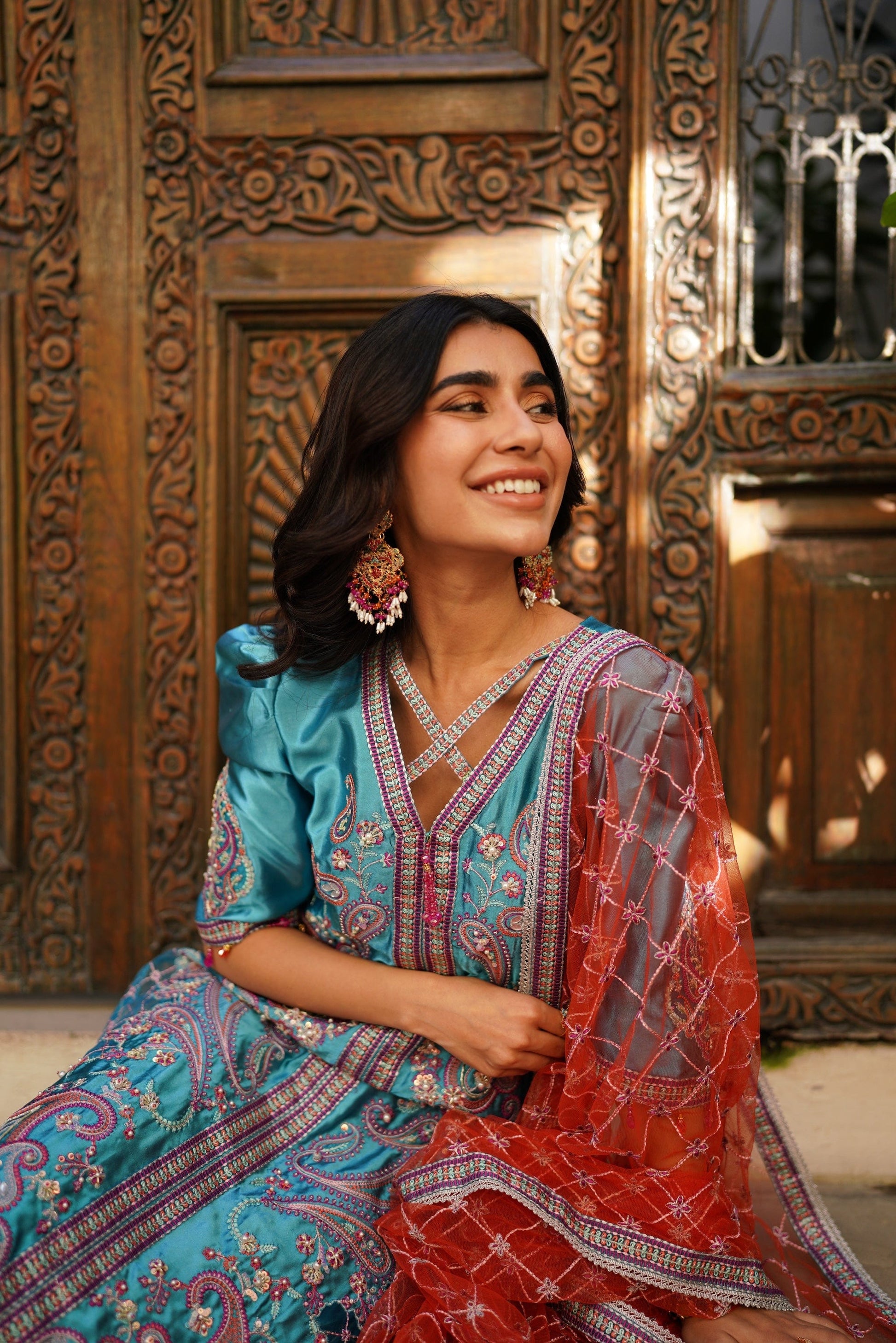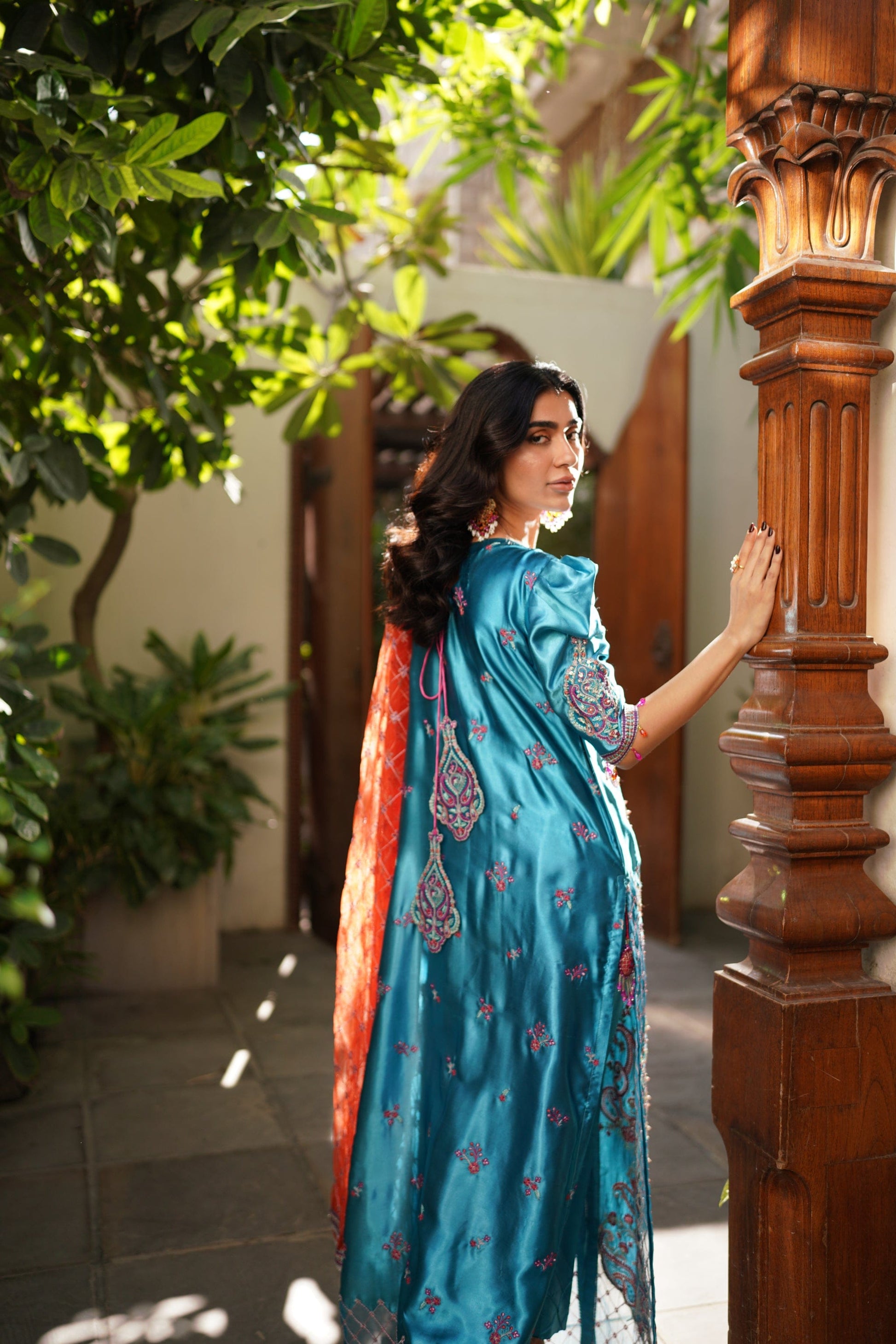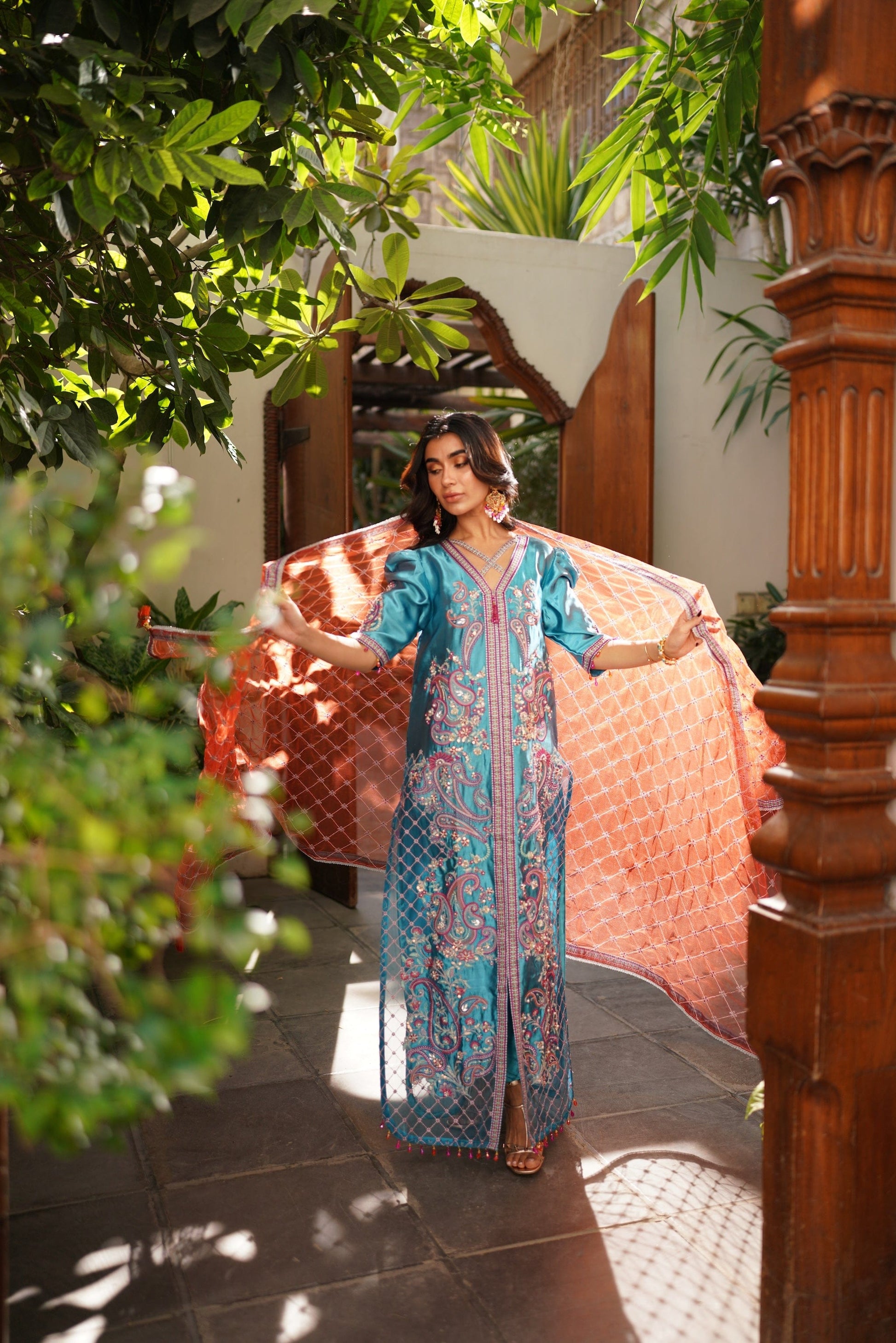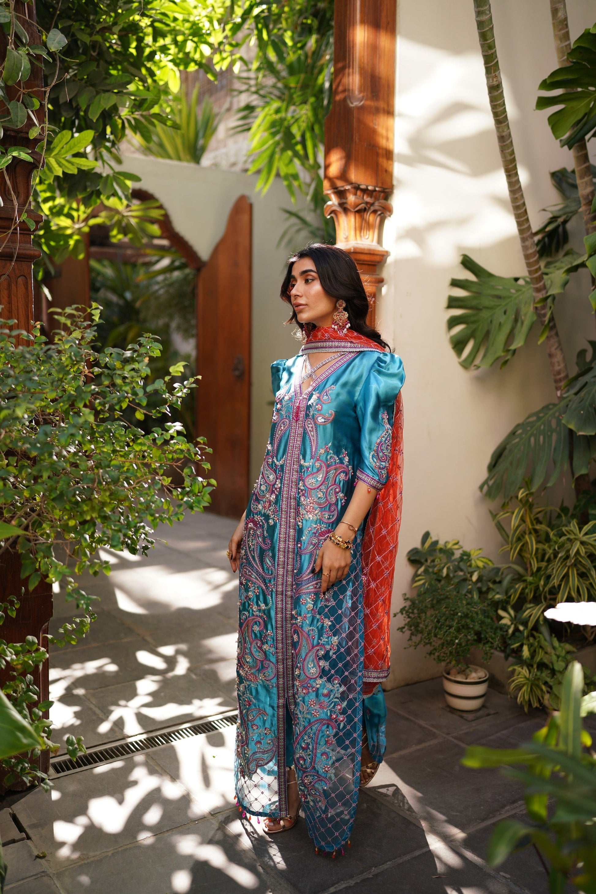 Paired with matching charmeuse silk trousers, the look is completed with a lightweight net dubatta that adds softness and movement. Timeless yet striking, Estelle is perfect for festive occasions and refined celebrations.