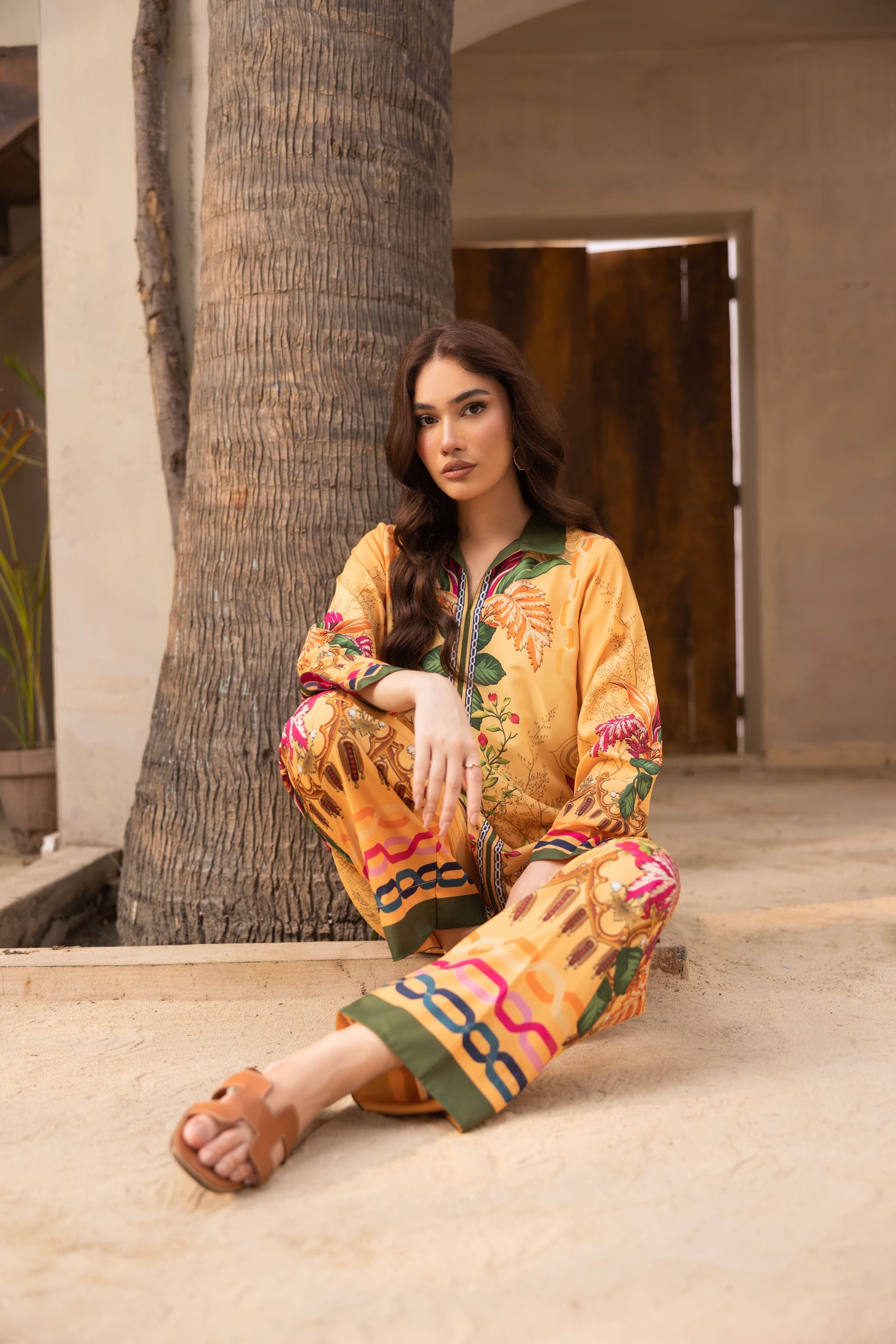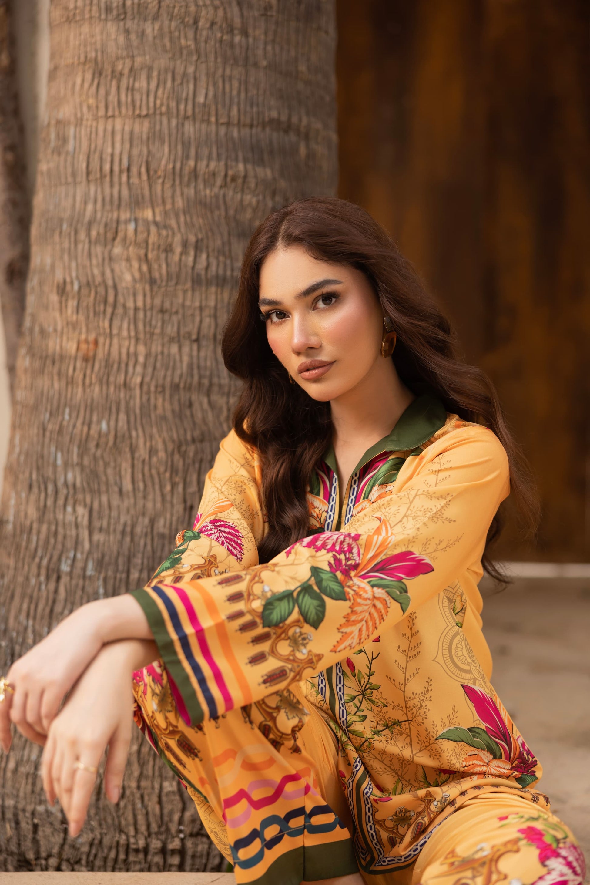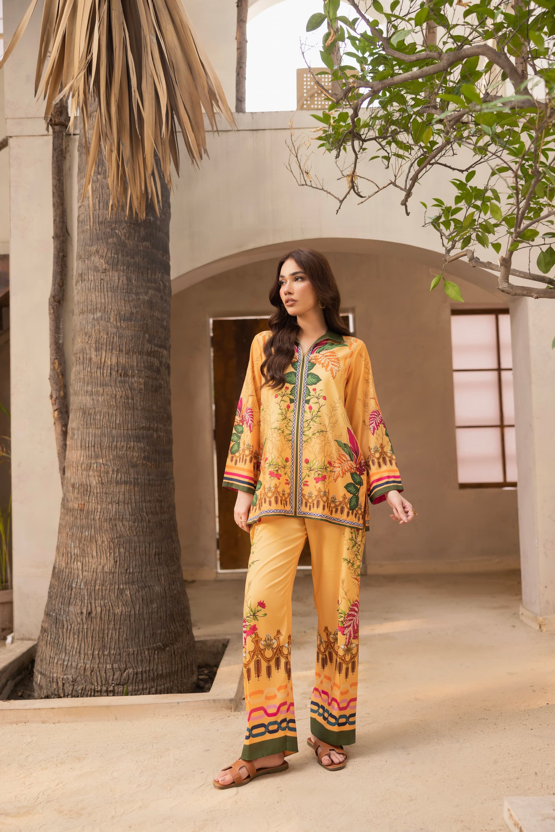 Bold, vibrant, and effortlessly elegant: Floresta is a stunning ambertoned co-ord set crafted from premium crepe silk. Adorned with lush floral and ornamental prints in shades of pink, green, and gold, the shirt features a straight-cut silhouette with statement borders, paired perfectly with matching wide-leg trousers. A radiant ensemble for festive lunches, day events, or destination wear.