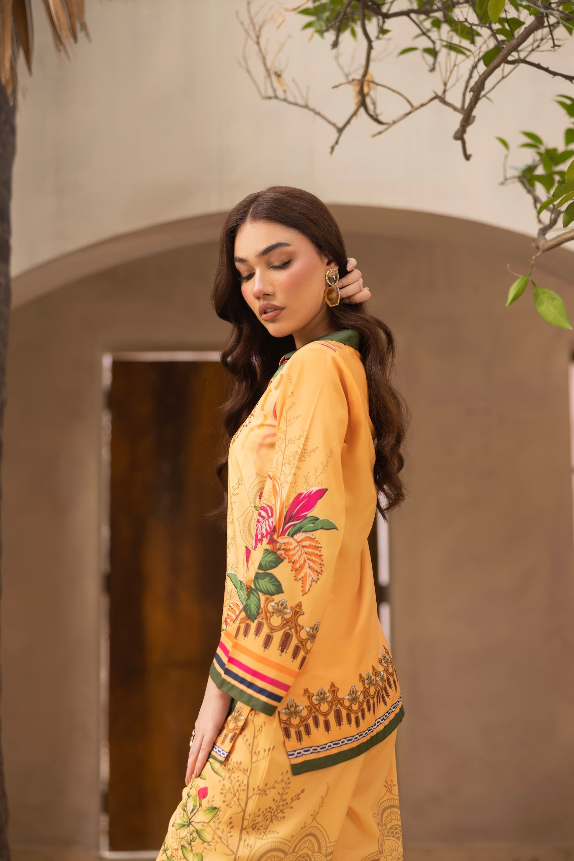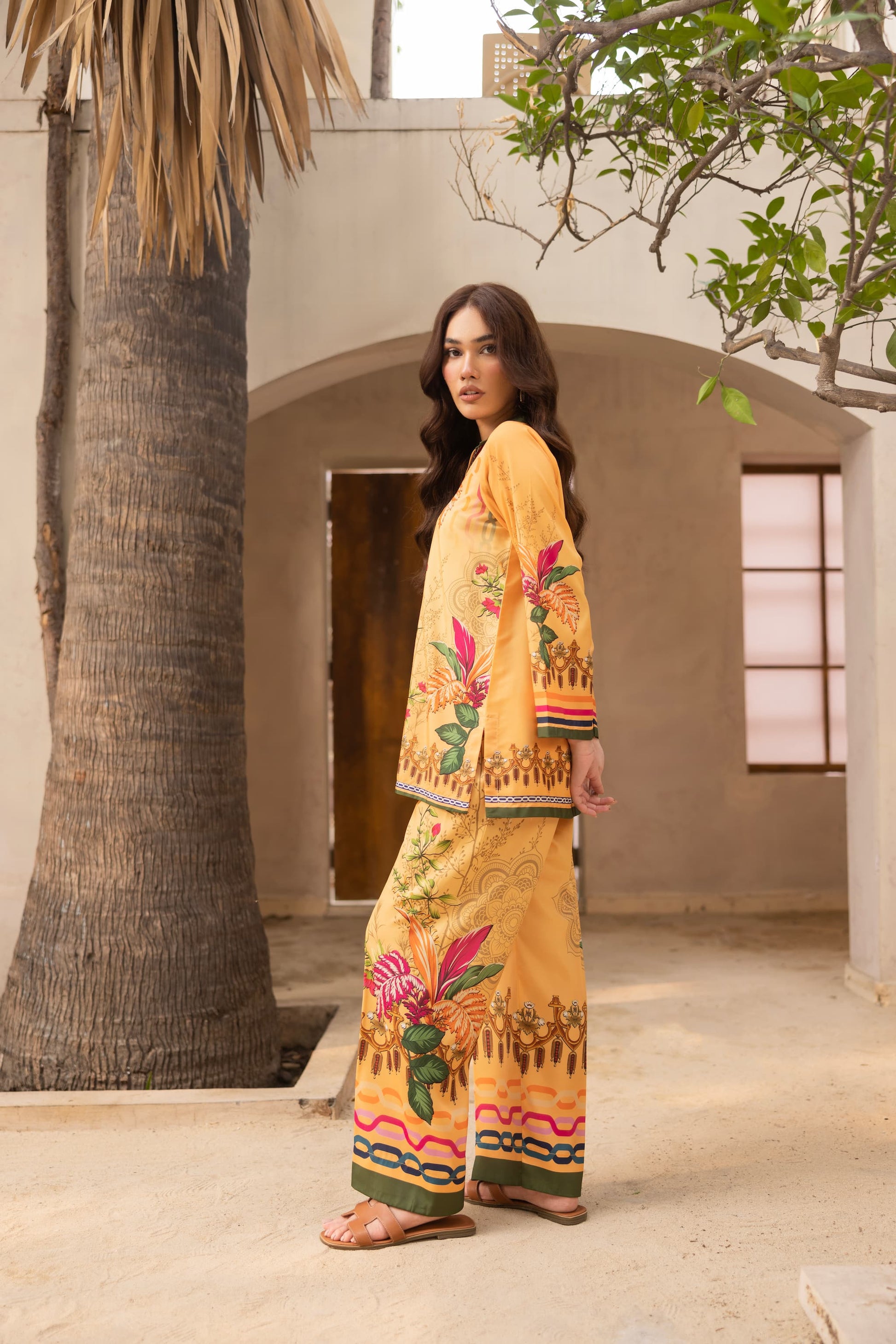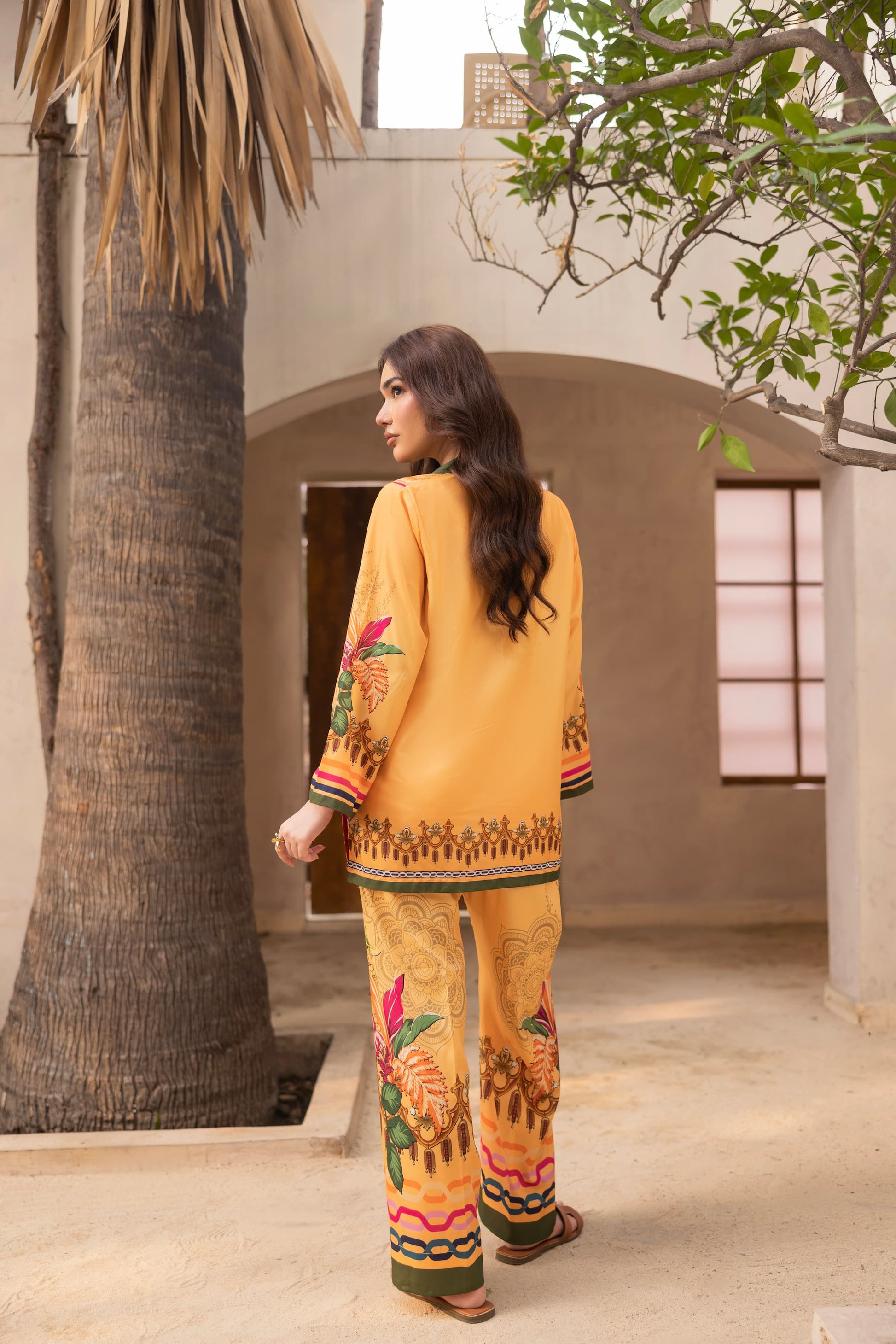 Bold, vibrant, and effortlessly elegant: Floresta is a stunning ambertoned co-ord set crafted from premium crepe silk. Adorned with lush floral and ornamental prints in shades of pink, green, and gold, the shirt features a straight-cut silhouette with statement borders, paired perfectly with matching wide-leg trousers. A radiant ensemble for festive lunches, day events, or destination wear.