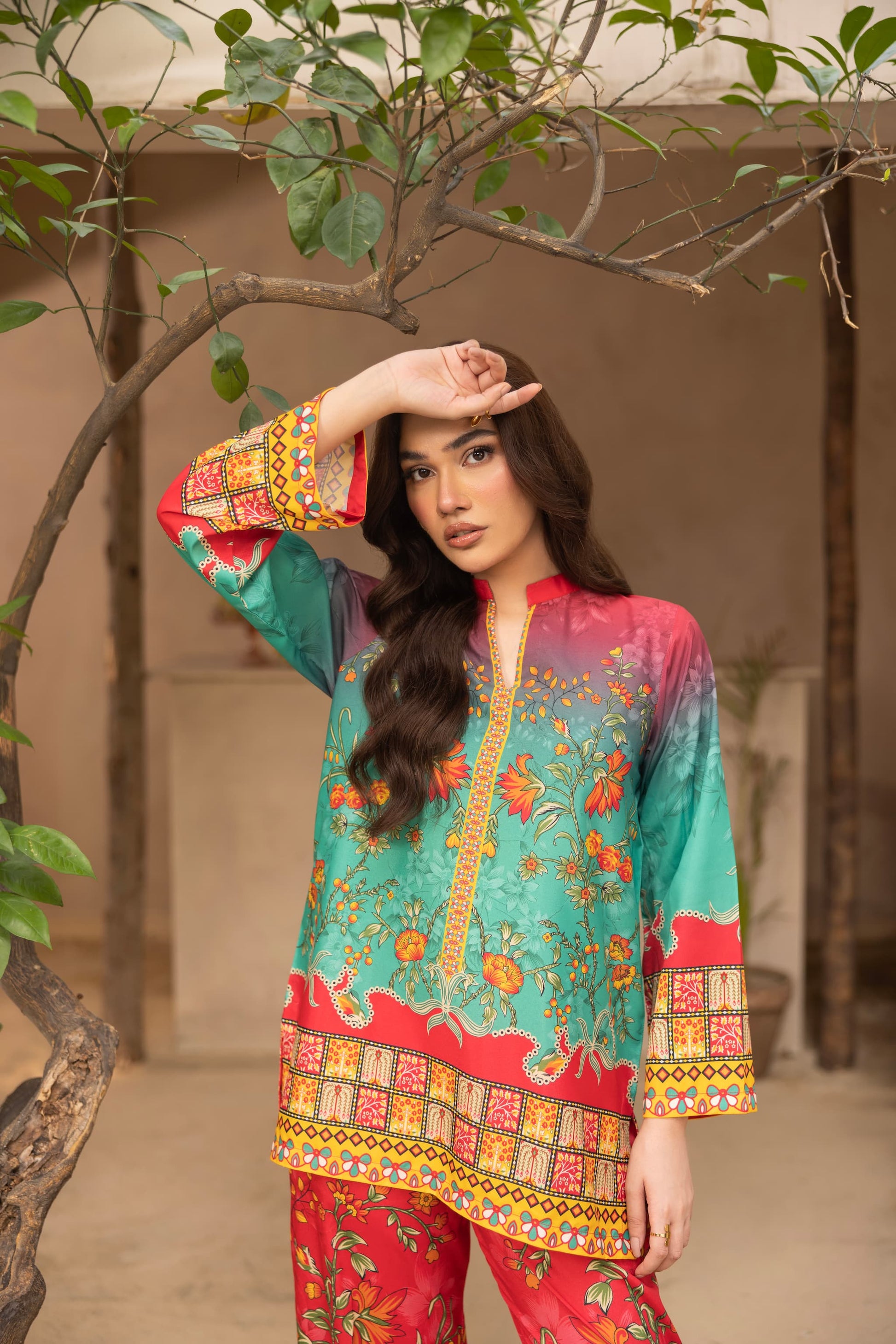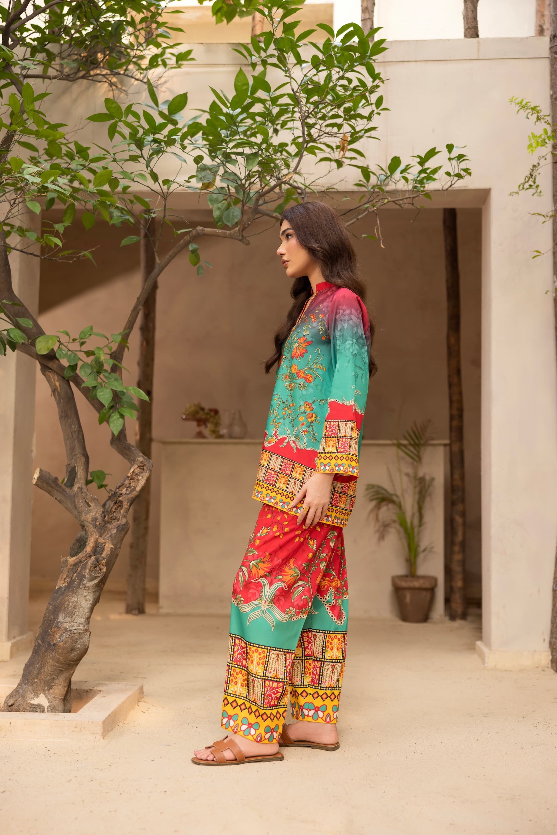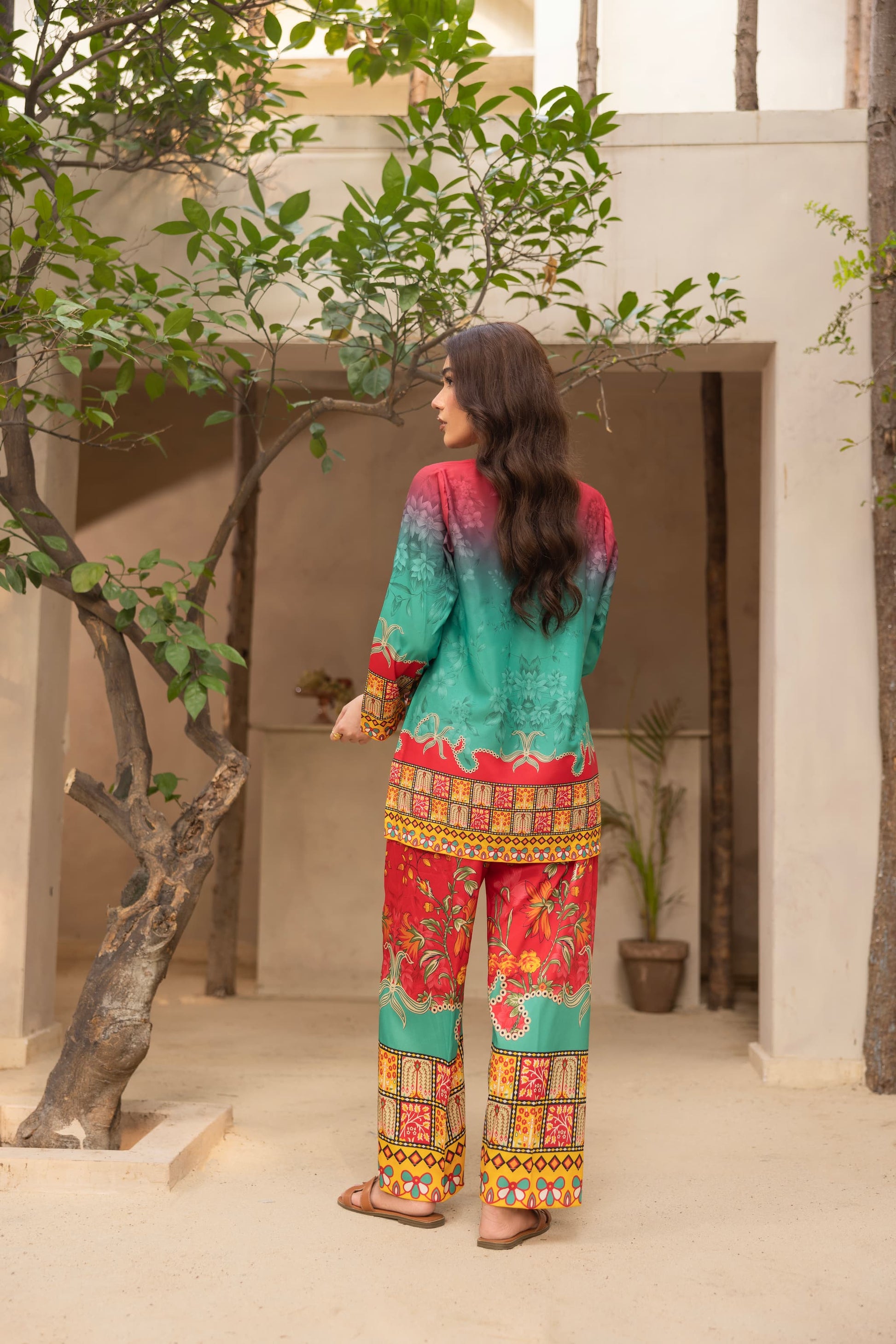 Step into a vibrant tropical paradise with our "Junglora" co-ord set. This stunning ensemble captures the essence of exotic elegance with its rich digital print, featuring a captivating gradient that flows from a fiery coral red into a deep, lush teal. The straight-cut kurta is adorned with beautiful botanical florals and framed by intricate, geometric borders along the placket, cuffs, and hemline. Paired with matching straight-leg trousers that continue the bold pattern, this set creates a seamless, sophisticated silhouette. Crafted for both comfort and standout style, the Junglora set is a perfect statement piece for any occasion, promising an effortlessly chic and memorable look.
