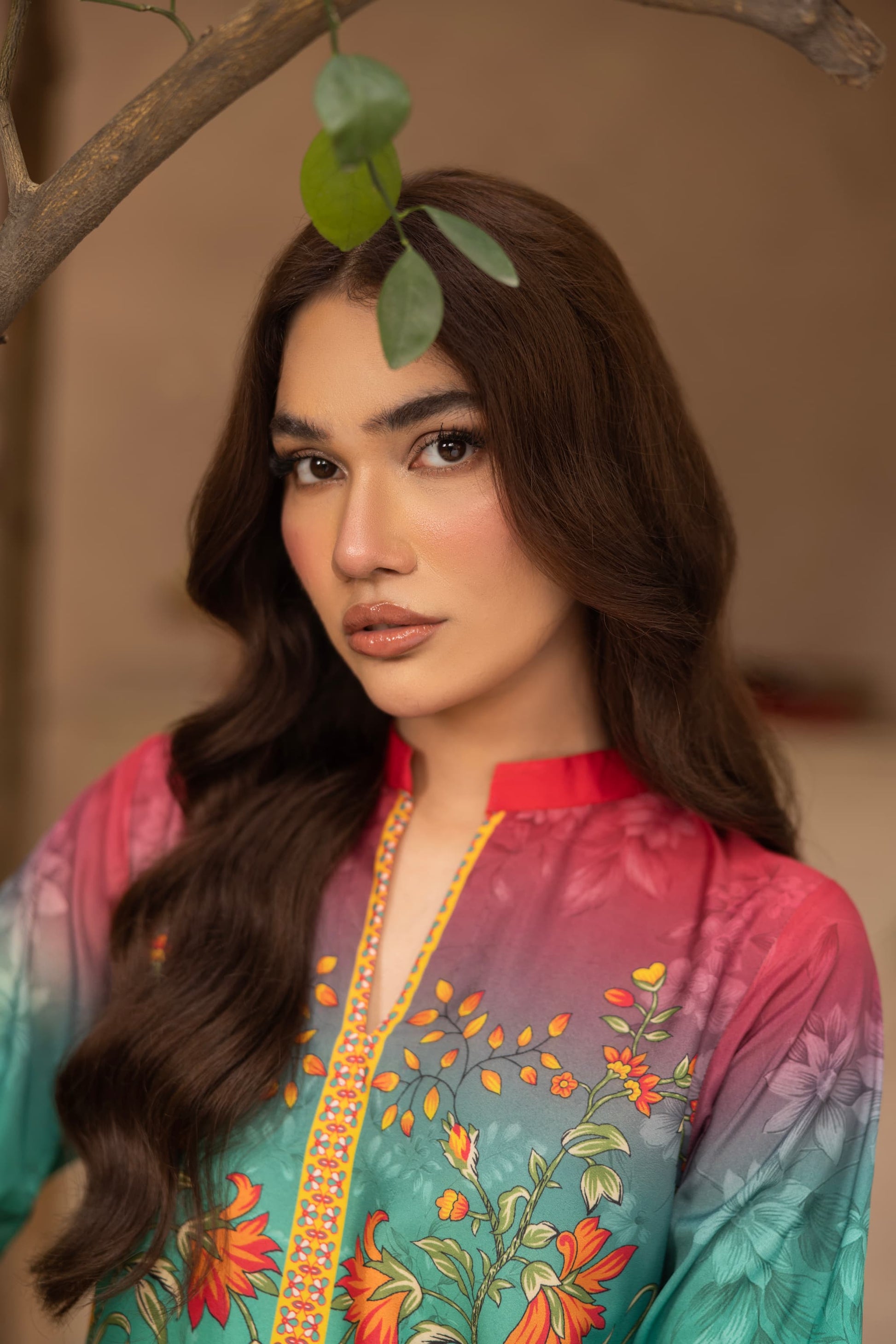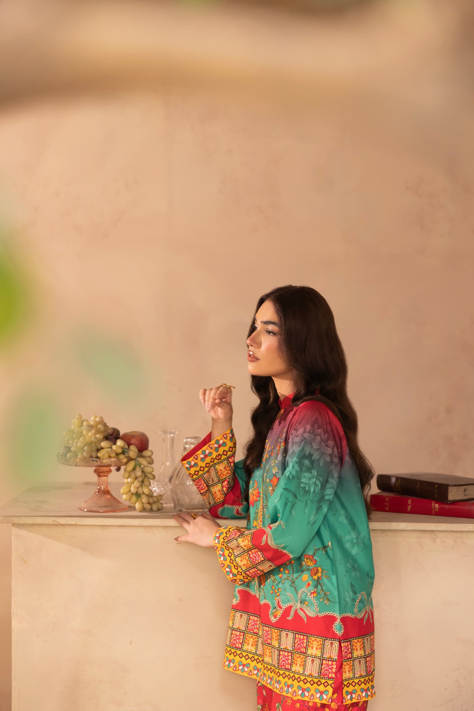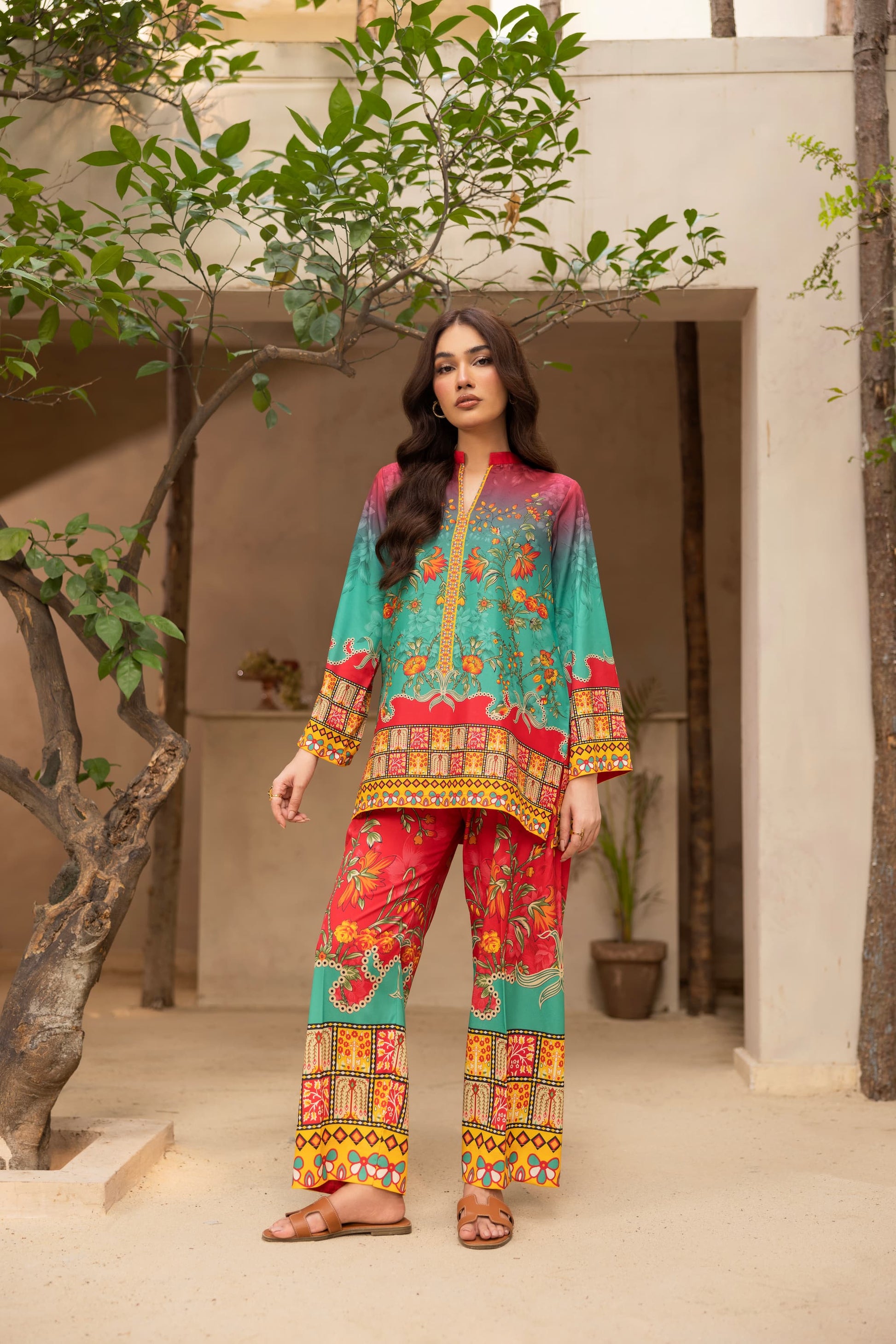 Step into a vibrant tropical paradise with our "Junglora" co-ord set. This stunning ensemble captures the essence of exotic elegance with its rich digital print, featuring a captivating gradient that flows from a fiery coral red into a deep, lush teal. The straight-cut kurta is adorned with beautiful botanical florals and framed by intricate, geometric borders along the placket, cuffs, and hemline. Paired with matching straight-leg trousers that continue the bold pattern, this set creates a seamless, sophisticated silhouette. Crafted for both comfort and standout style, the Junglora set is a perfect statement piece for any occasion, promising an effortlessly chic and memorable look.