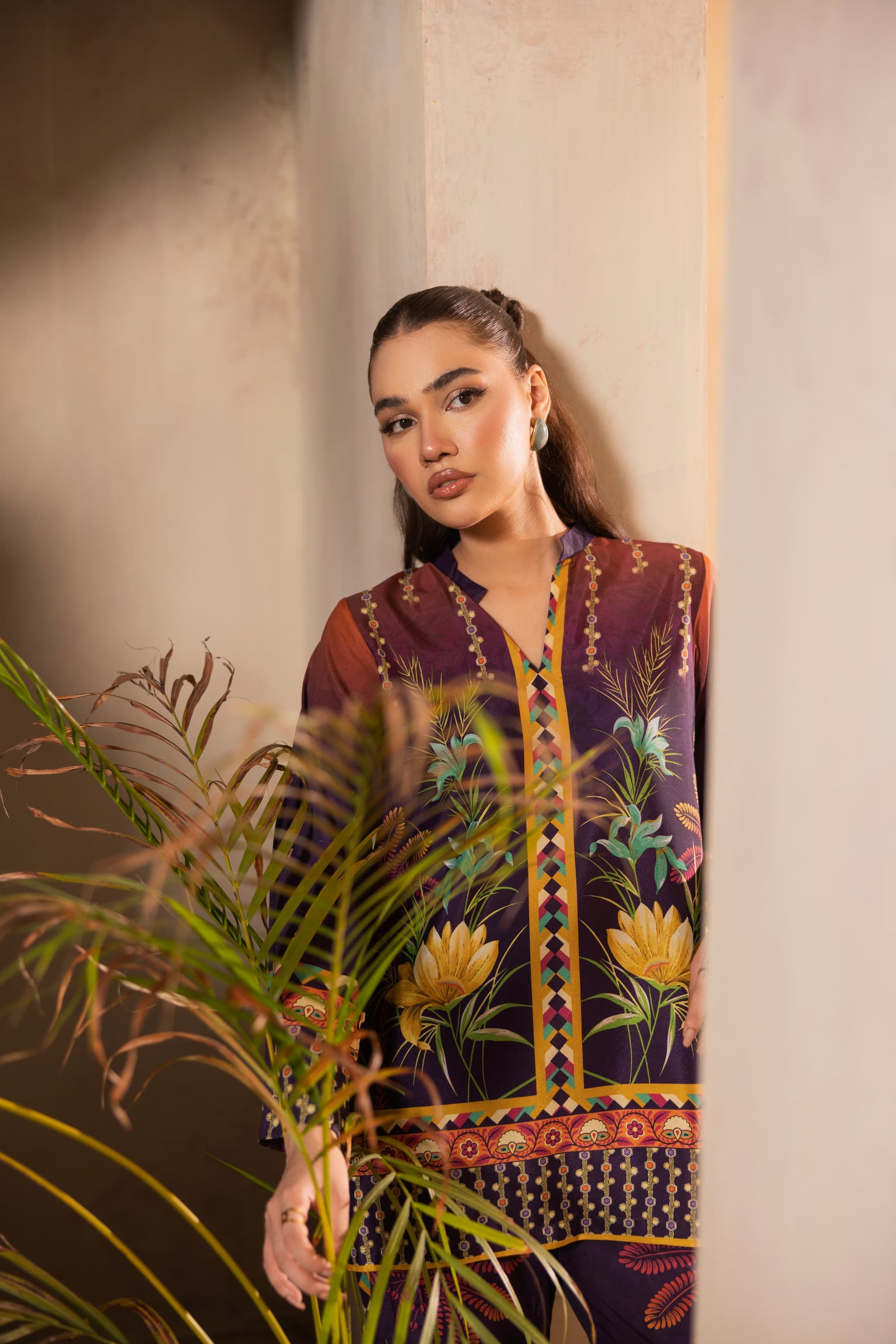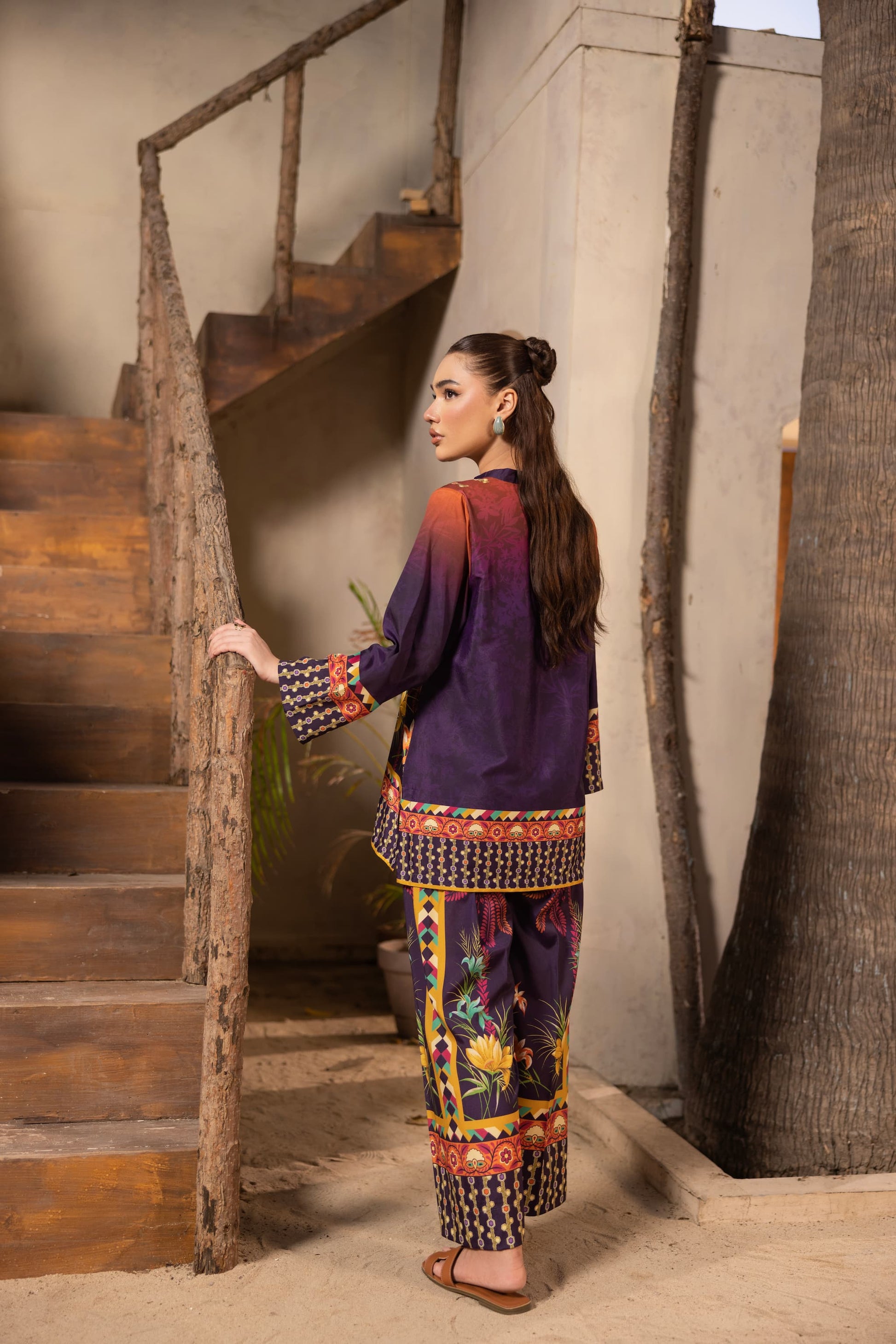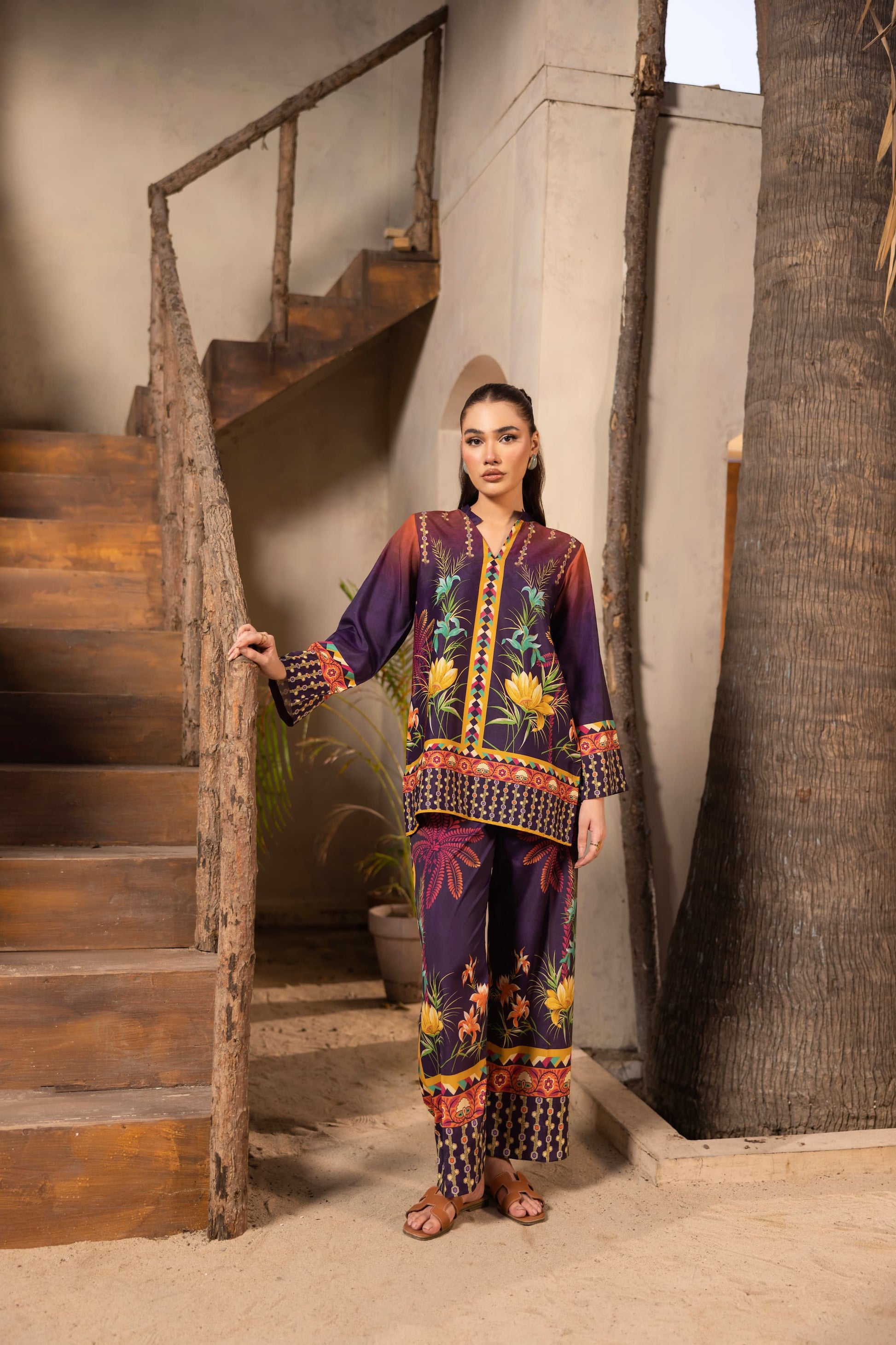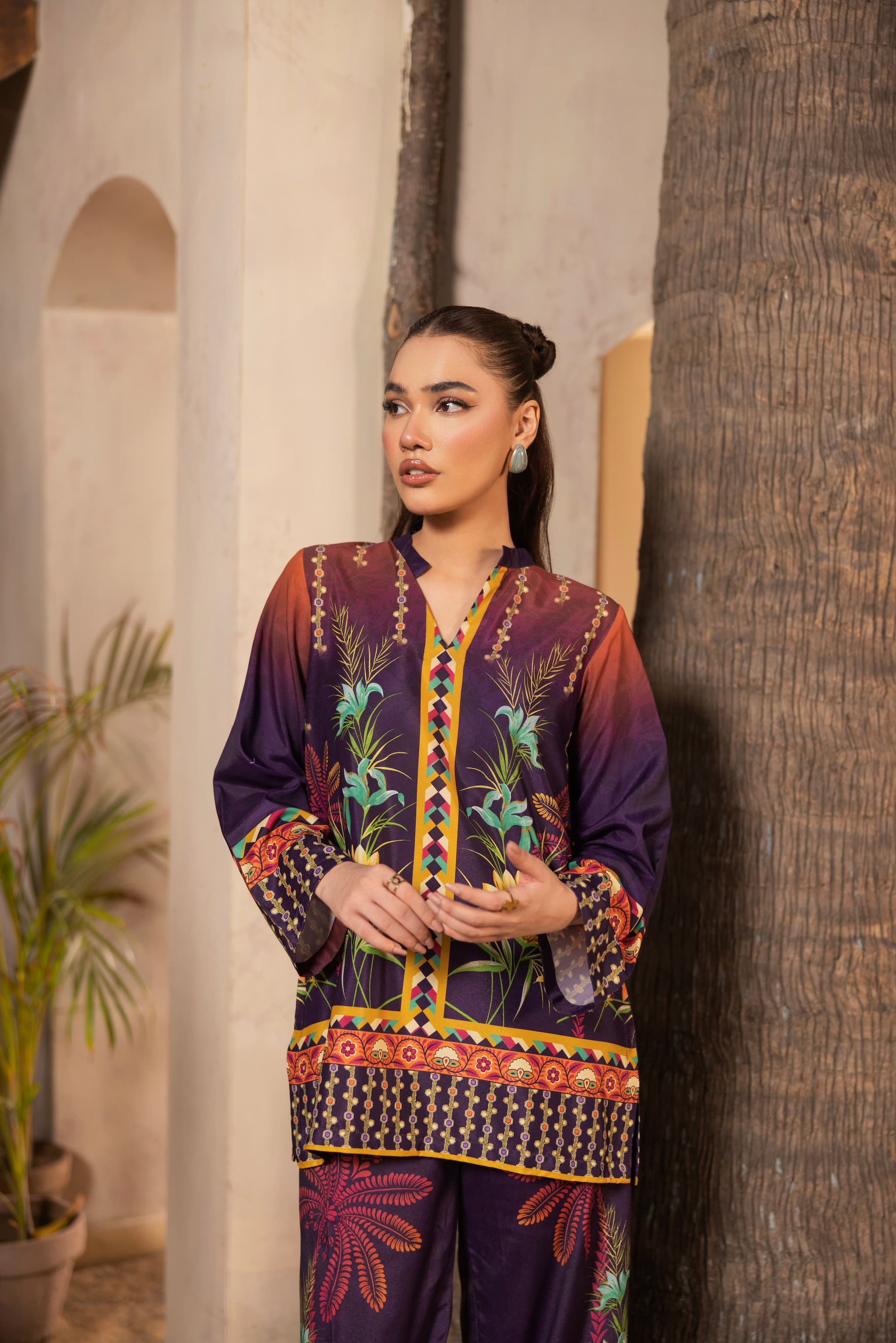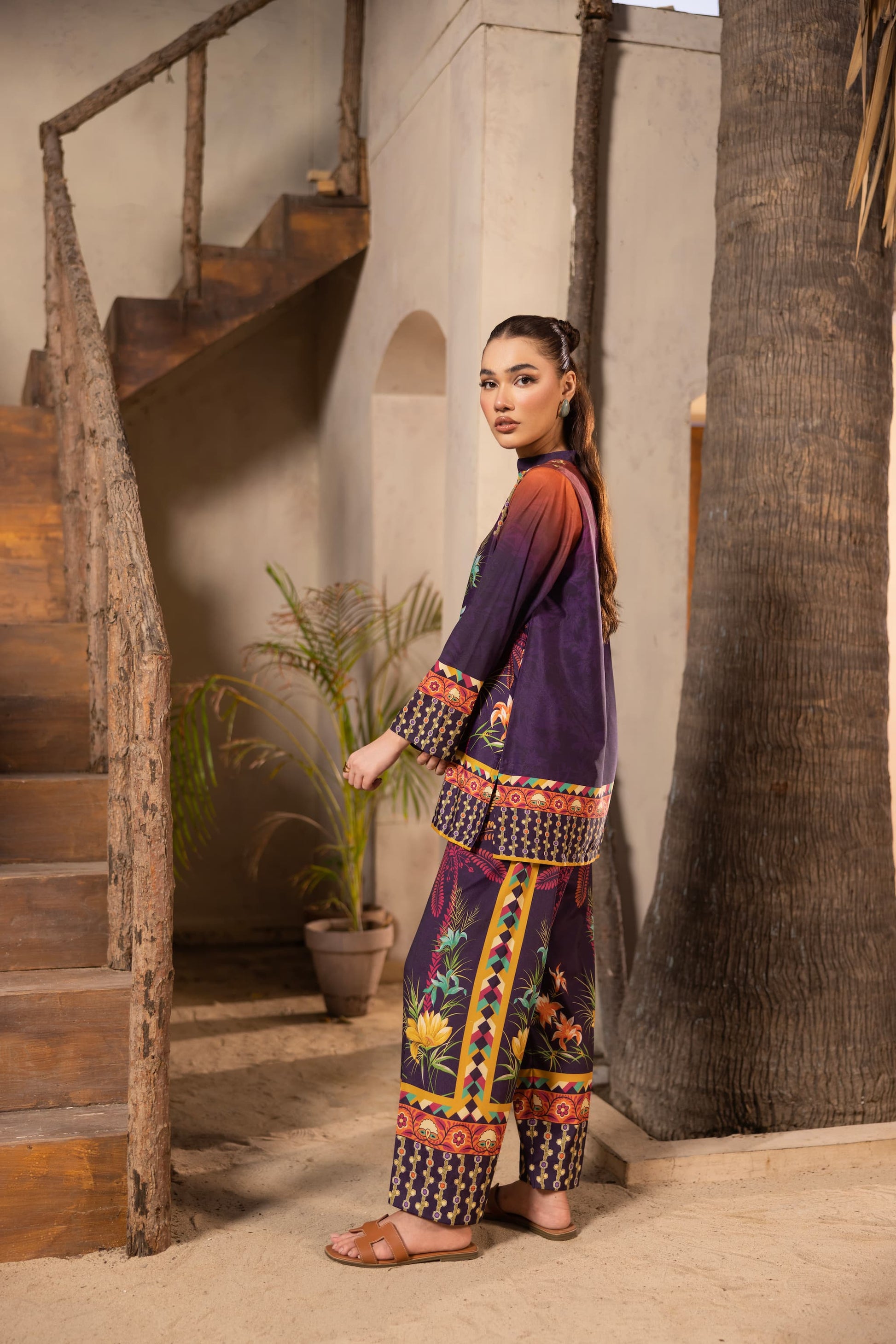Channel effortless confidence with Mystic Palm: a head-turning co-ord set in a striking fuchsia hue, elevated with vivid palm-inspired motifs and ornate patterns. Crafted from crepe silk, this set is designed for the modern muse who embraces boldness with grace. The shirt features a collared neckline and flared sleeves, while the trousers bring drama with statement borders and intricate detailing. Perfect for moments that call for colour and charisma: from festive brunches to destination escapes.