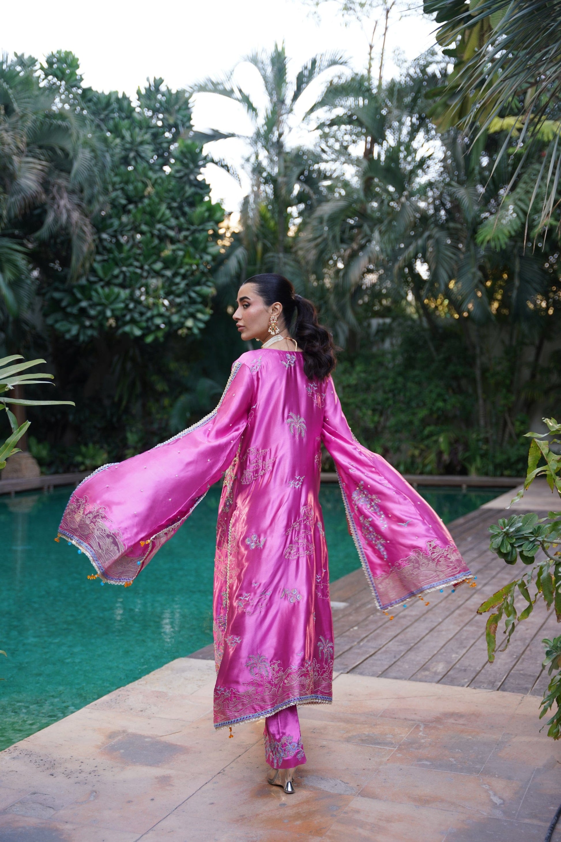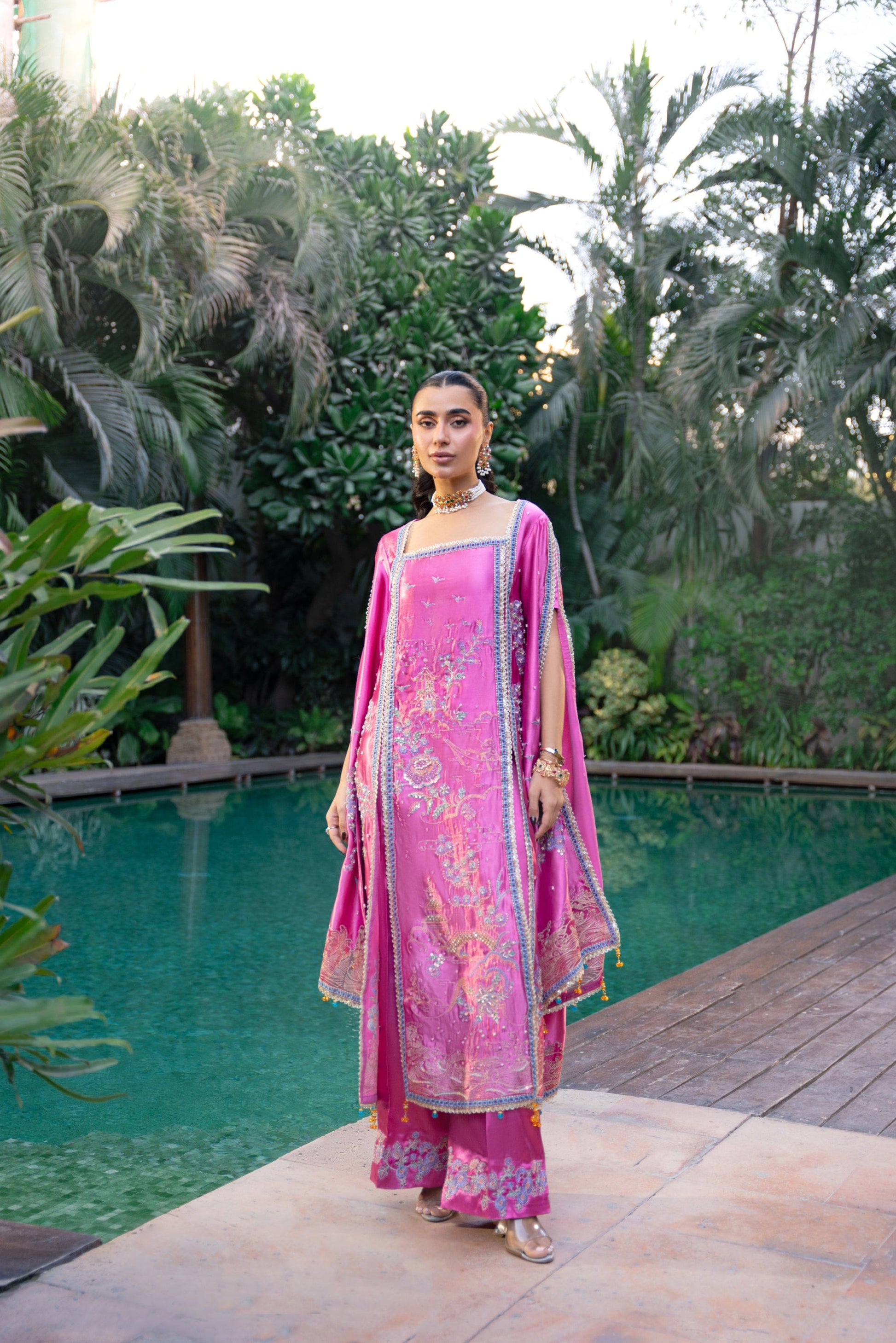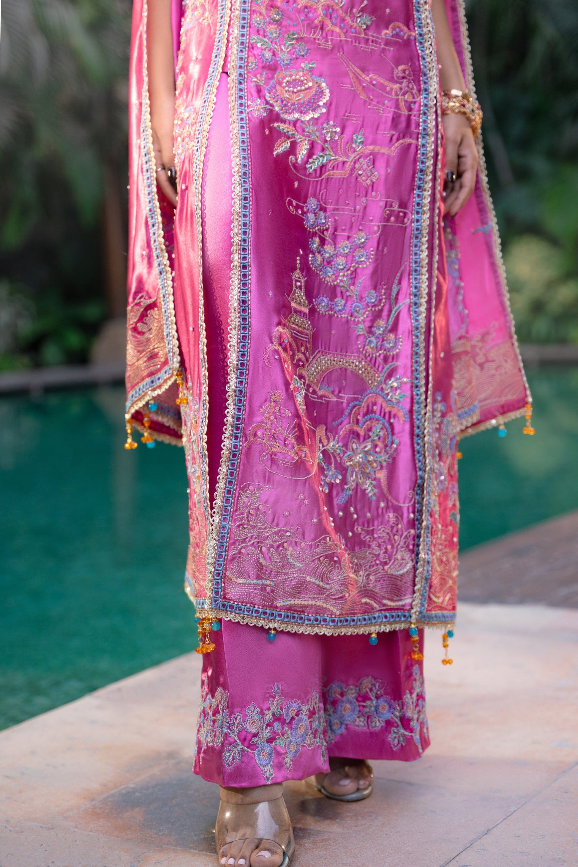 Nooraya is designed to command attention through colour, movement, and intricate artistry. Crafted entirely from luminous charmeuse silk in a vivid hot pink hue, the look is defined by its flowing shirt with dramatic cape-style sleeves that create a sense of effortless motion. Every detail is carefully considered, with vibrant embroidery layered with sequin highlights and fine adda work spread across the outfit, adding texture and richness from every angle.