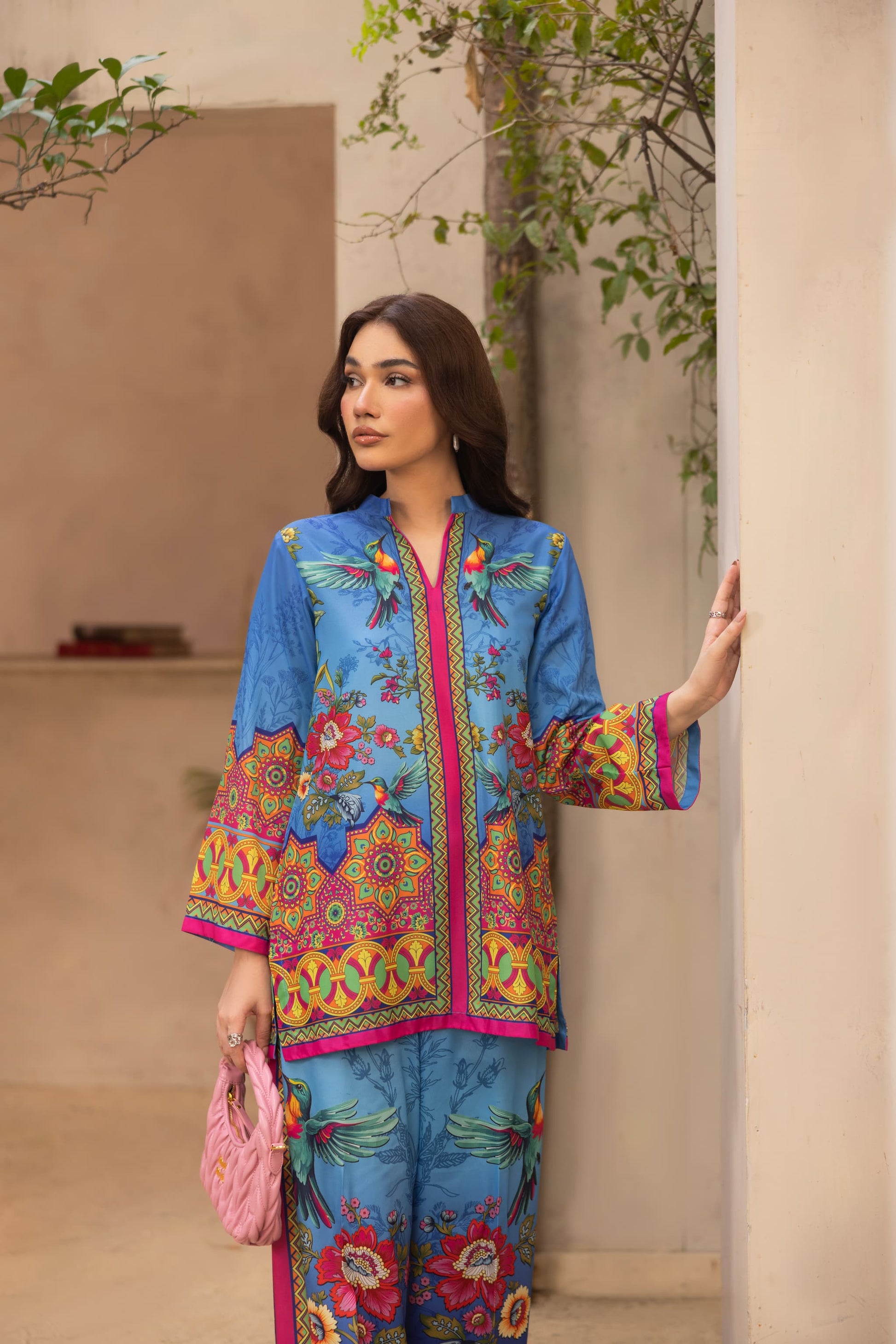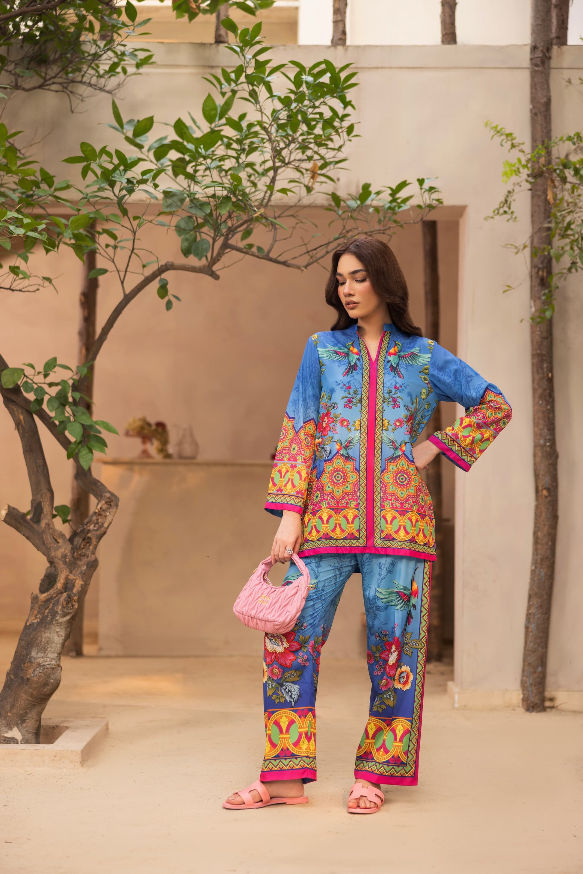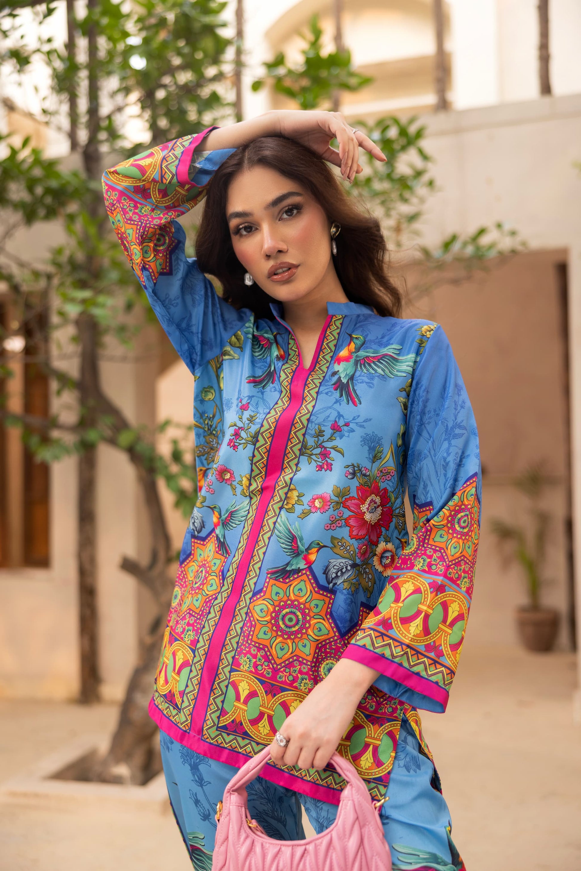 Make waves in OceanAra, a striking co-ord set that blends oceanic cool tones with bursts of vibrant florals and tropical bird motifs. The soft blue crepe silk base is elevated with bold yellow, pink, and red detailing, bringing movement and flair to every step. With a relaxed silhouette and rich, artistic print placement, this look is made for sunny escapes, resort brunches, or effortless day-to-evening transitions.