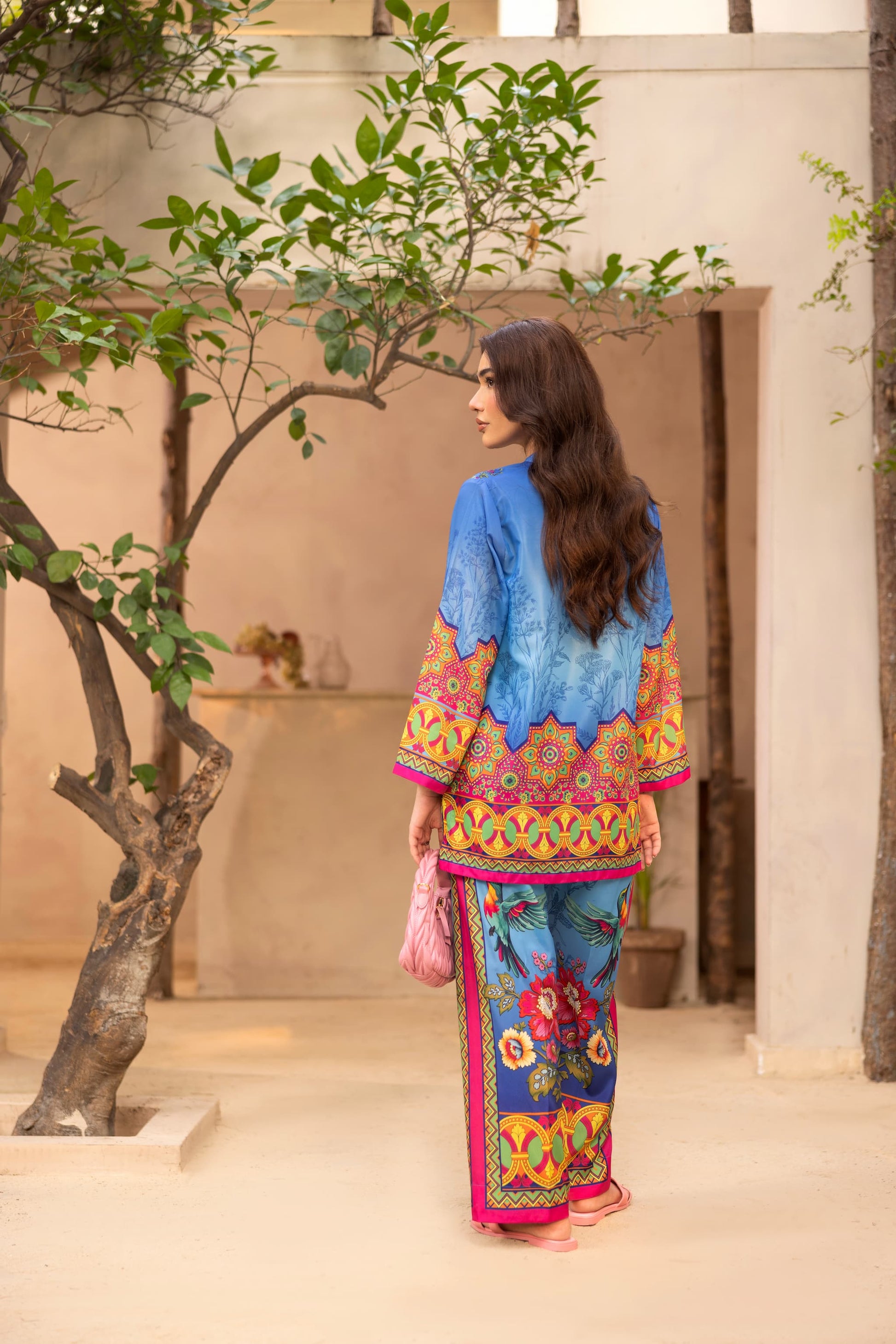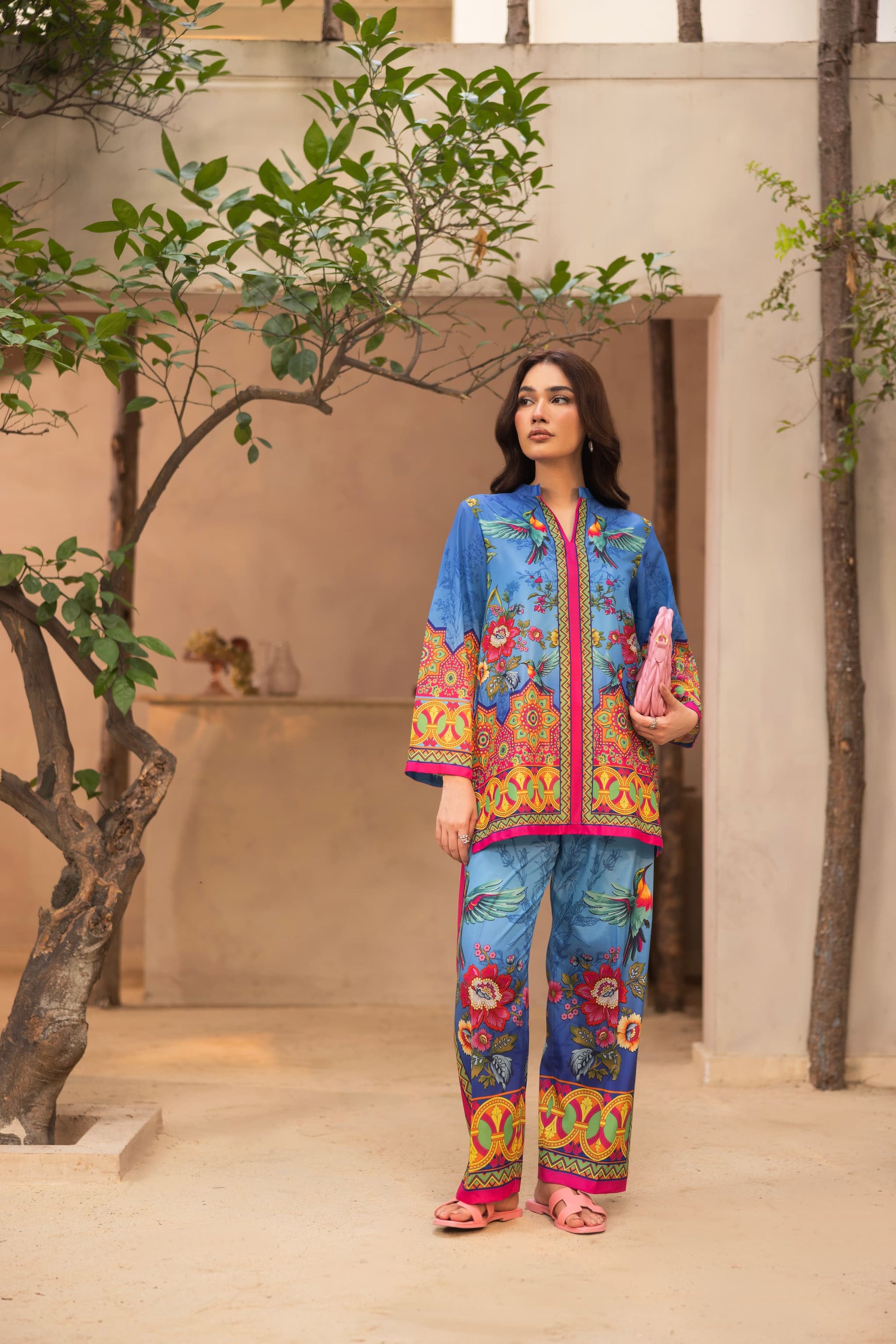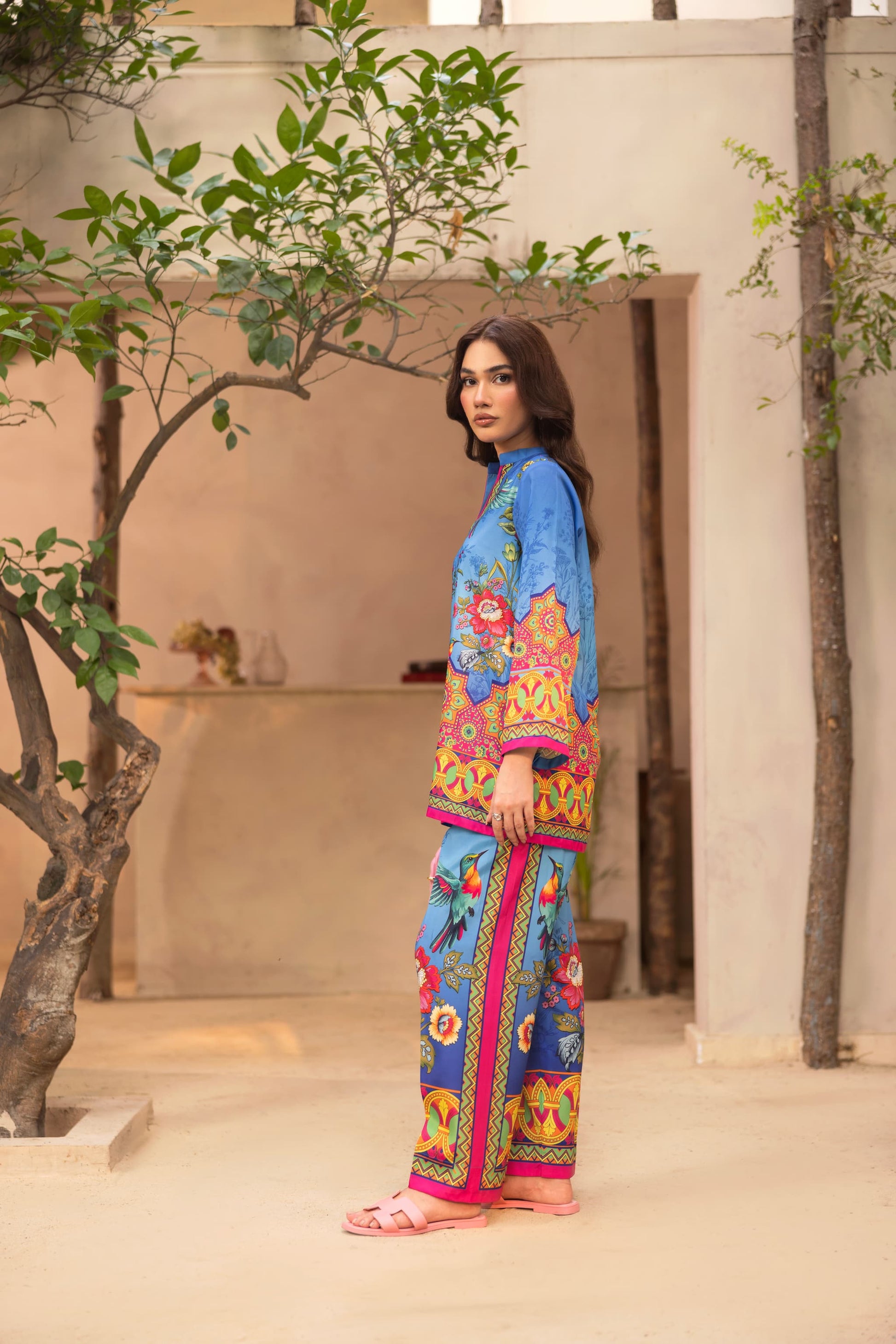 Make waves in OceanAra, a striking co-ord set that blends oceanic cool tones with bursts of vibrant florals and tropical bird motifs. The soft blue crepe silk base is elevated with bold yellow, pink, and red detailing, bringing movement and flair to every step. With a relaxed silhouette and rich, artistic print placement, this look is made for sunny escapes, resort brunches, or effortless day-to-evening transitions.