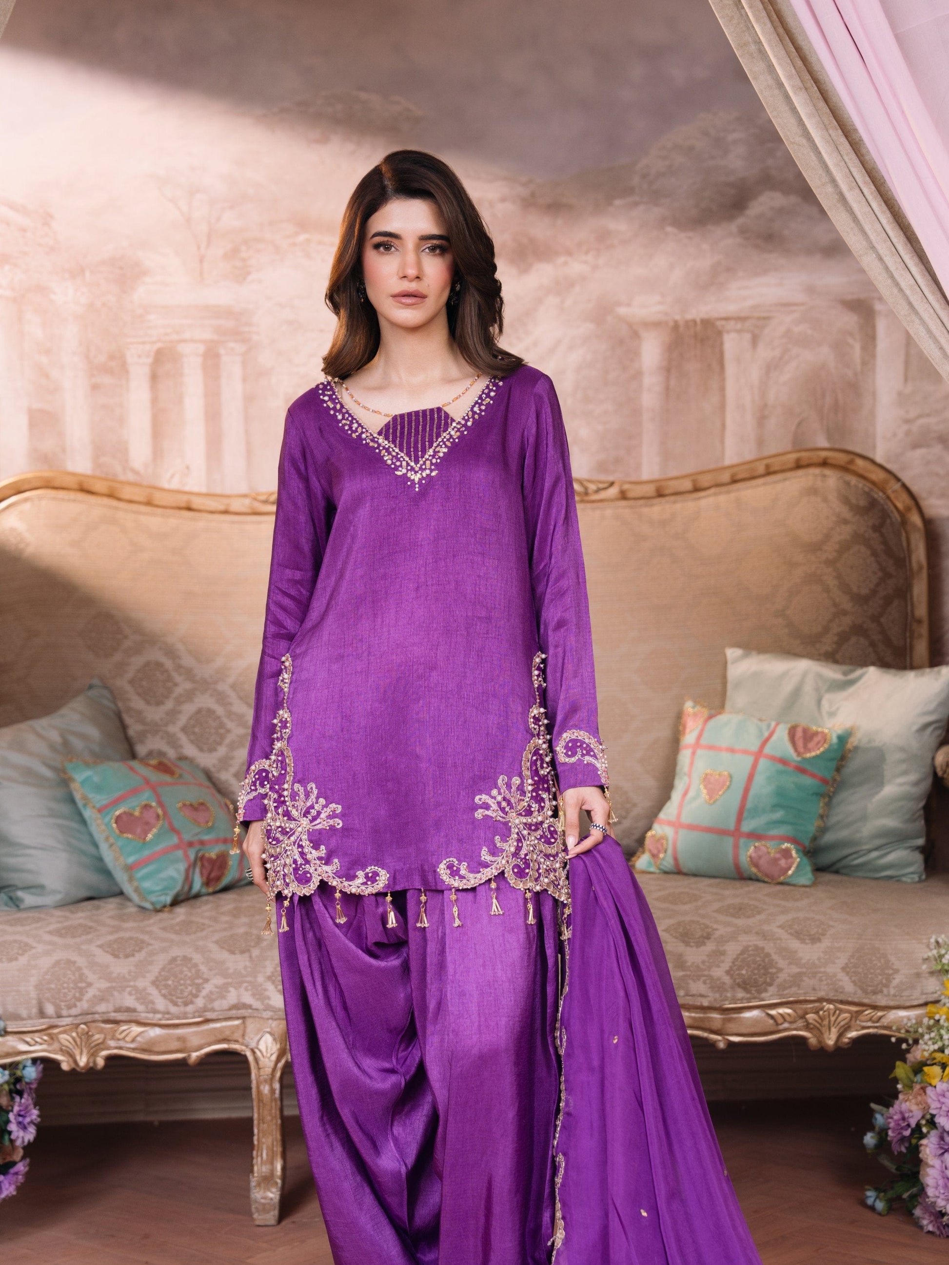 • Raniya is an elegant four-piece farshi shalwaar set designed in a rich purple hue, blending timeless craftsmanship with a refined contemporary feel. Crafted from Korean raw silk, the shirt and farshi shalwaar create a graceful silhouette enhanced with intricate adda work that highlights the embroidery beautifully. A unique cutline neckline adds a distinctive design element, while delicate tussling at the bottom of the shirt introduces subtle movement and charm. The look is completed with a complementing potli, bringing the entire ensemble together effortlessly.