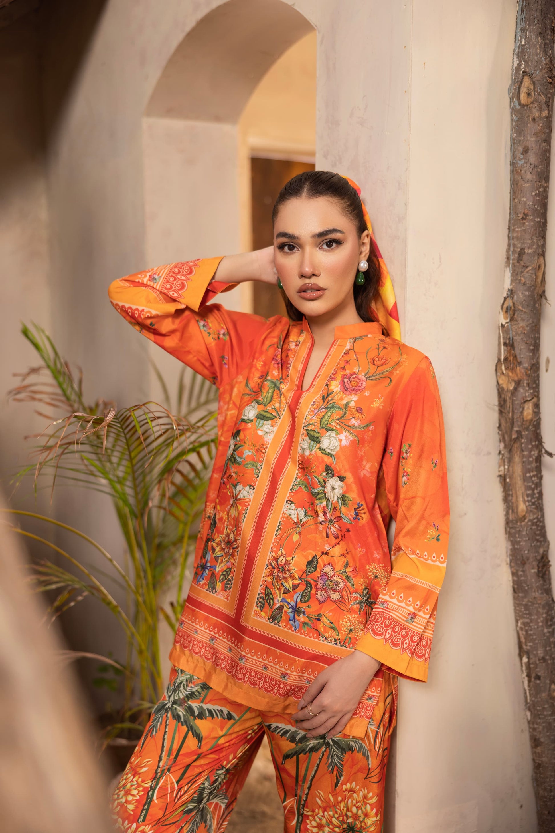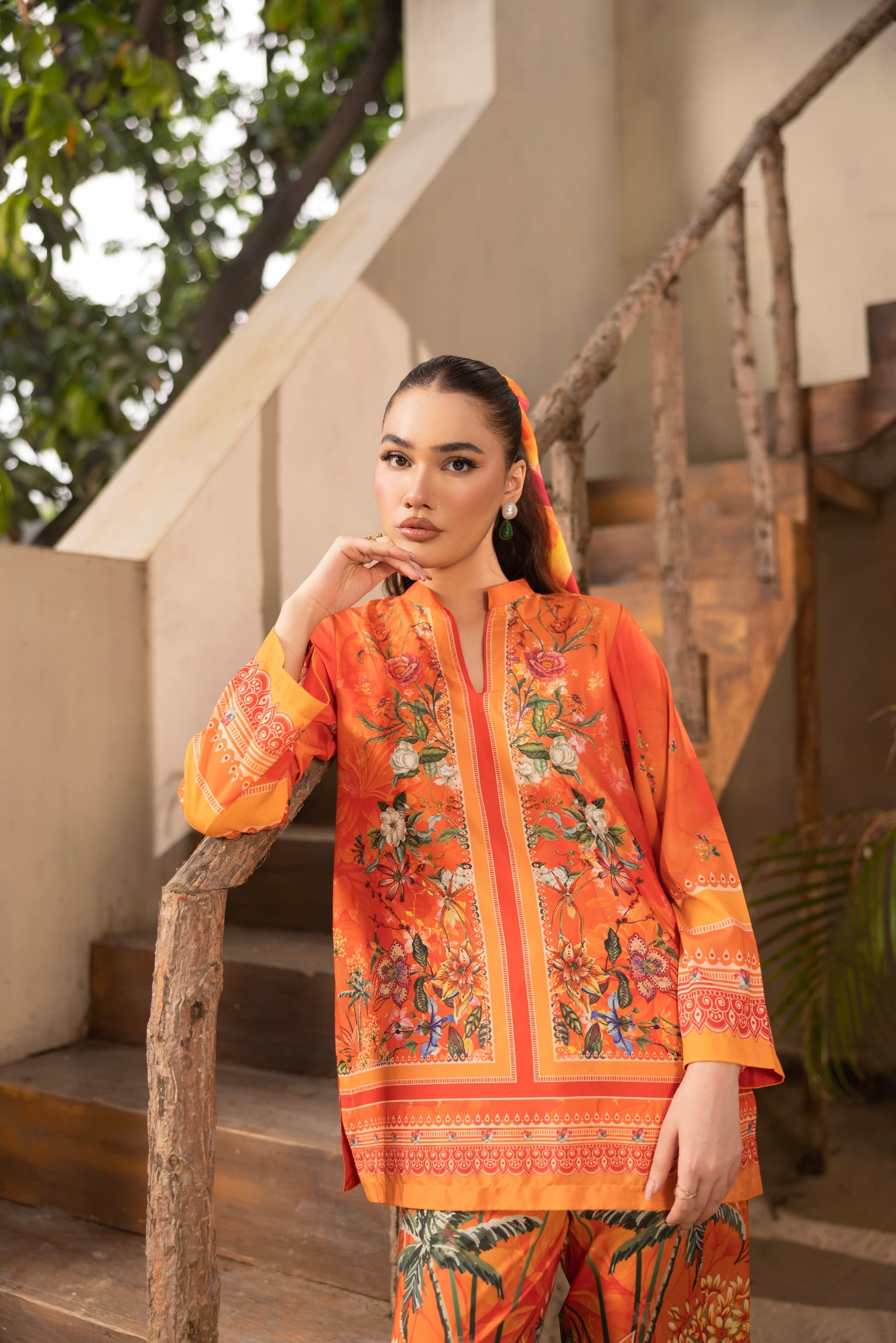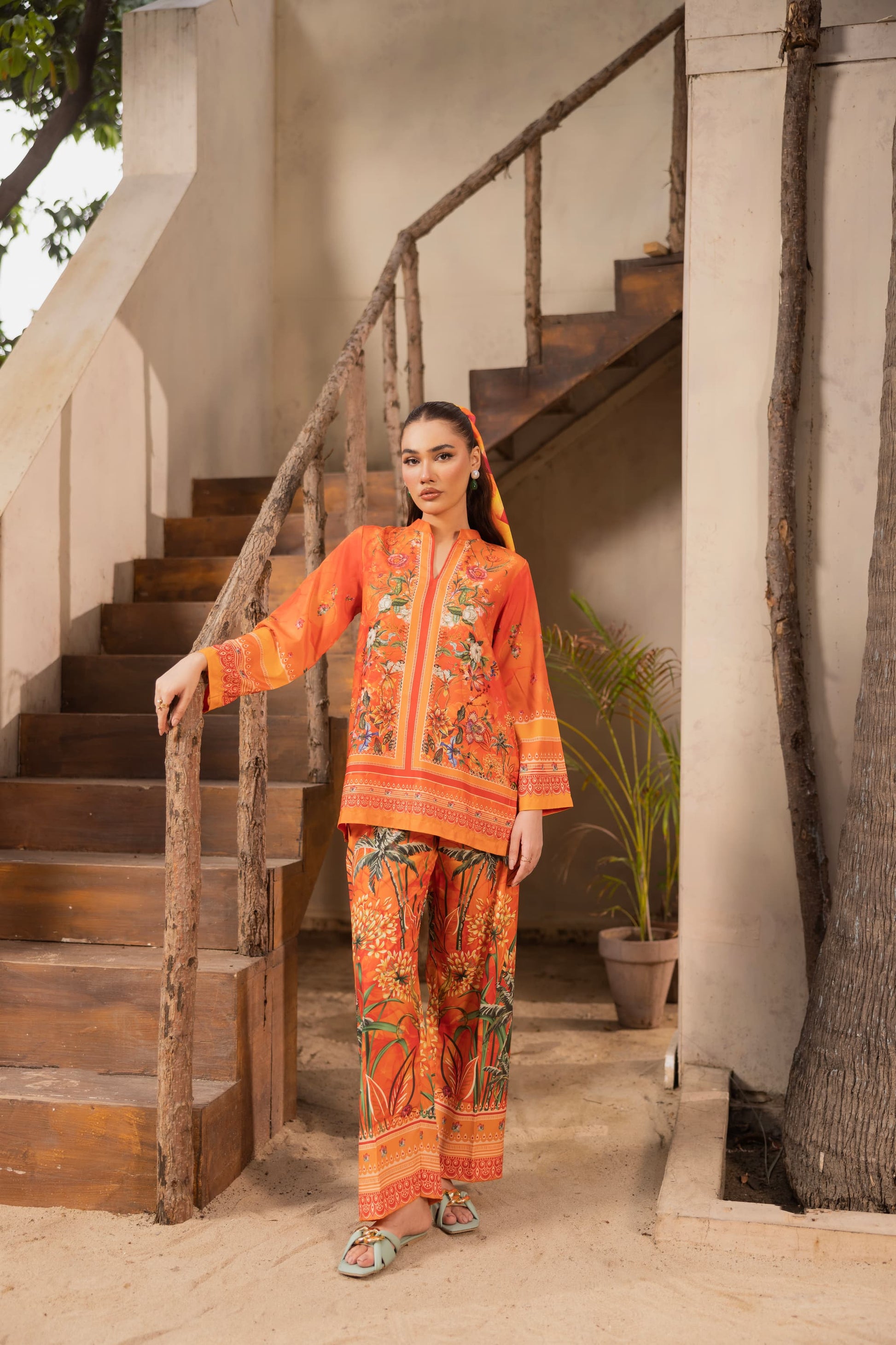 Radiating warmth and vibrancy, Tangerosa is a fiery ode to tropical elegance. Drenched in juicy orange tones, this co-ord set bursts with floral artistry and leafy botanical motifs that evoke the energy of sundrenched escapes. Crafted from airy crepe silk, the relaxed-fit shirt and flowing trousers offer effortless movement and striking visual appeal: perfect for summer days, garden brunches, or holiday getaways.